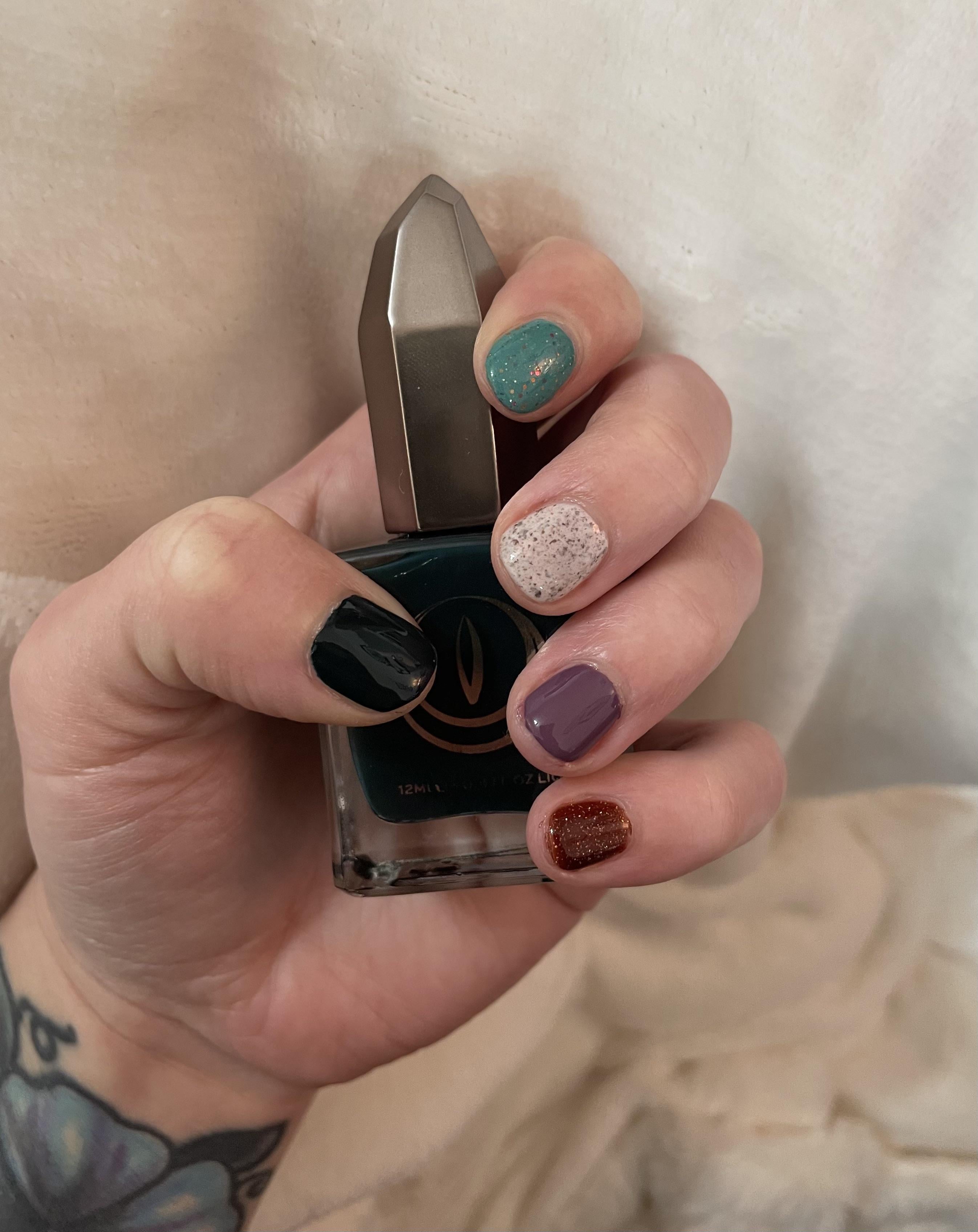 Base Coat: Holo Taco “Long Lasting Base” Top Coat: Londontown Kur “Gel Genius” Thumb: Mooncat “Poison Ivy” Pointer: Noodles Nail Polish “Fall Breeze & Crunchy Leaves” Middle: Night Owl Lacquer “Every Leaf Speaks Bliss to Me Ring: Mooncat “Freudian Slip” Pinky: ILNP “Spiced Cider”