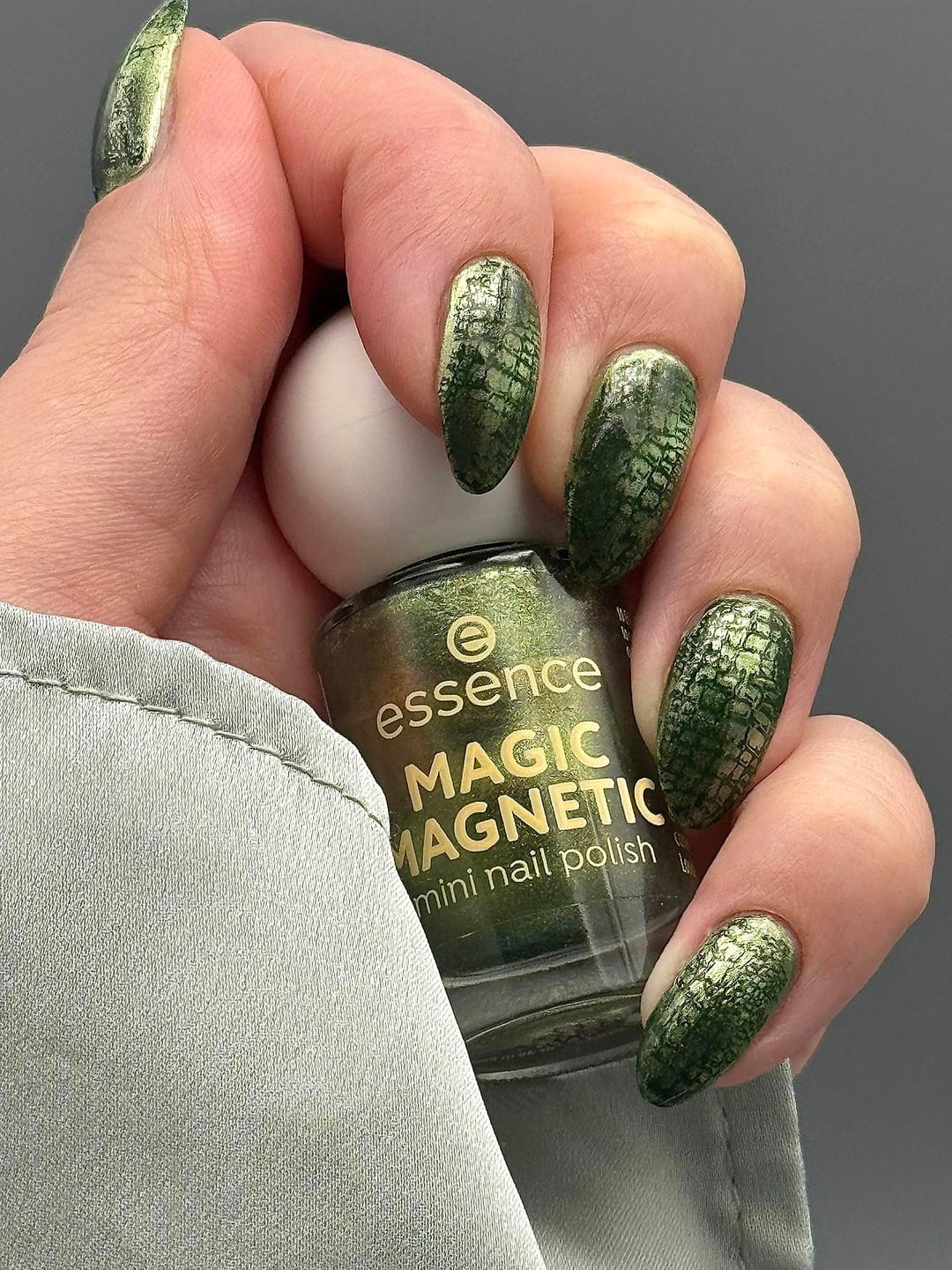 Essie smooth e base, Essence magic magnetic mini nail polish (this is the only color they have and thus does not have a separate name), KB shimmer QDTC, some nail stamping polish & random plate that had the croco print.