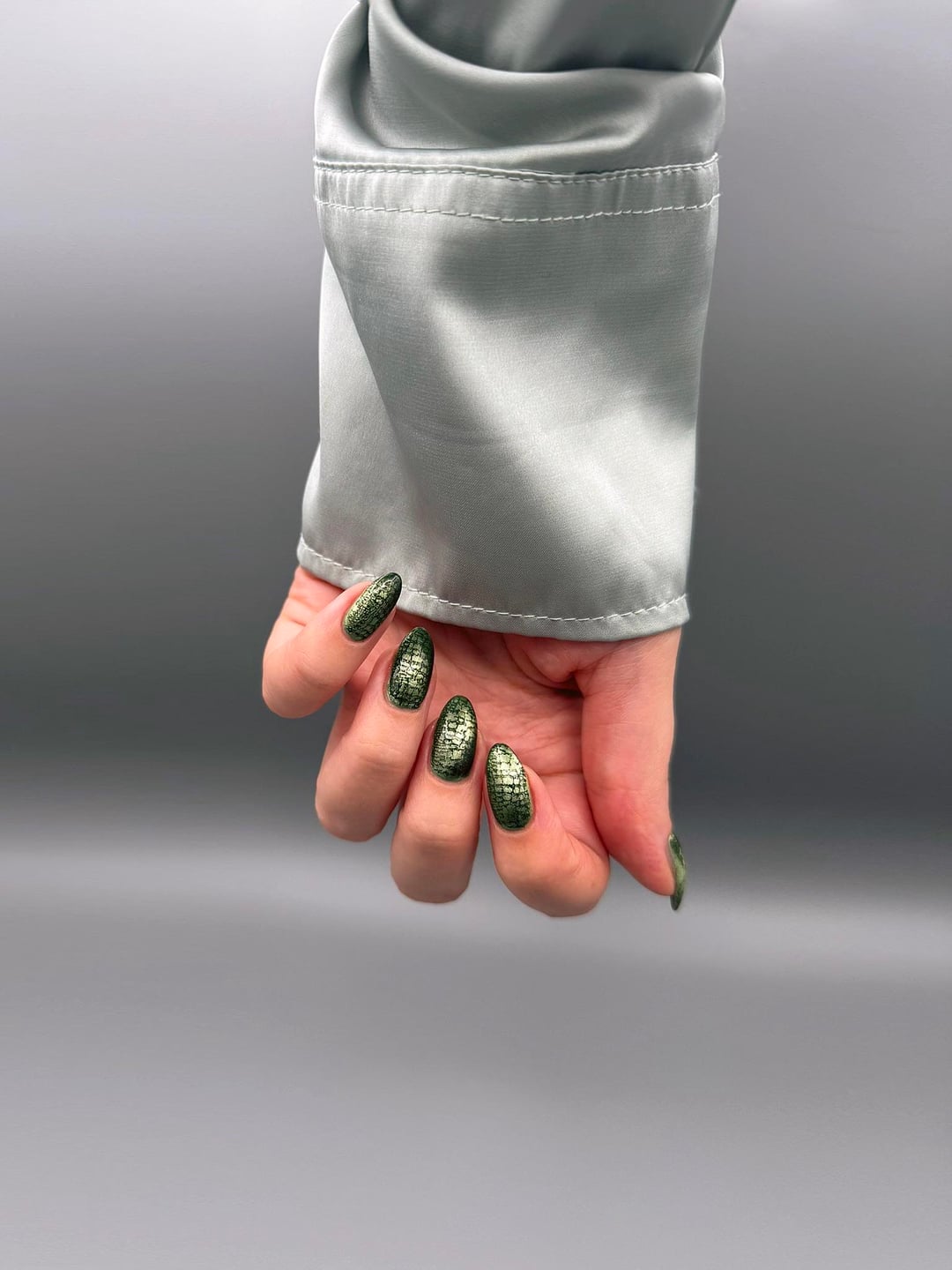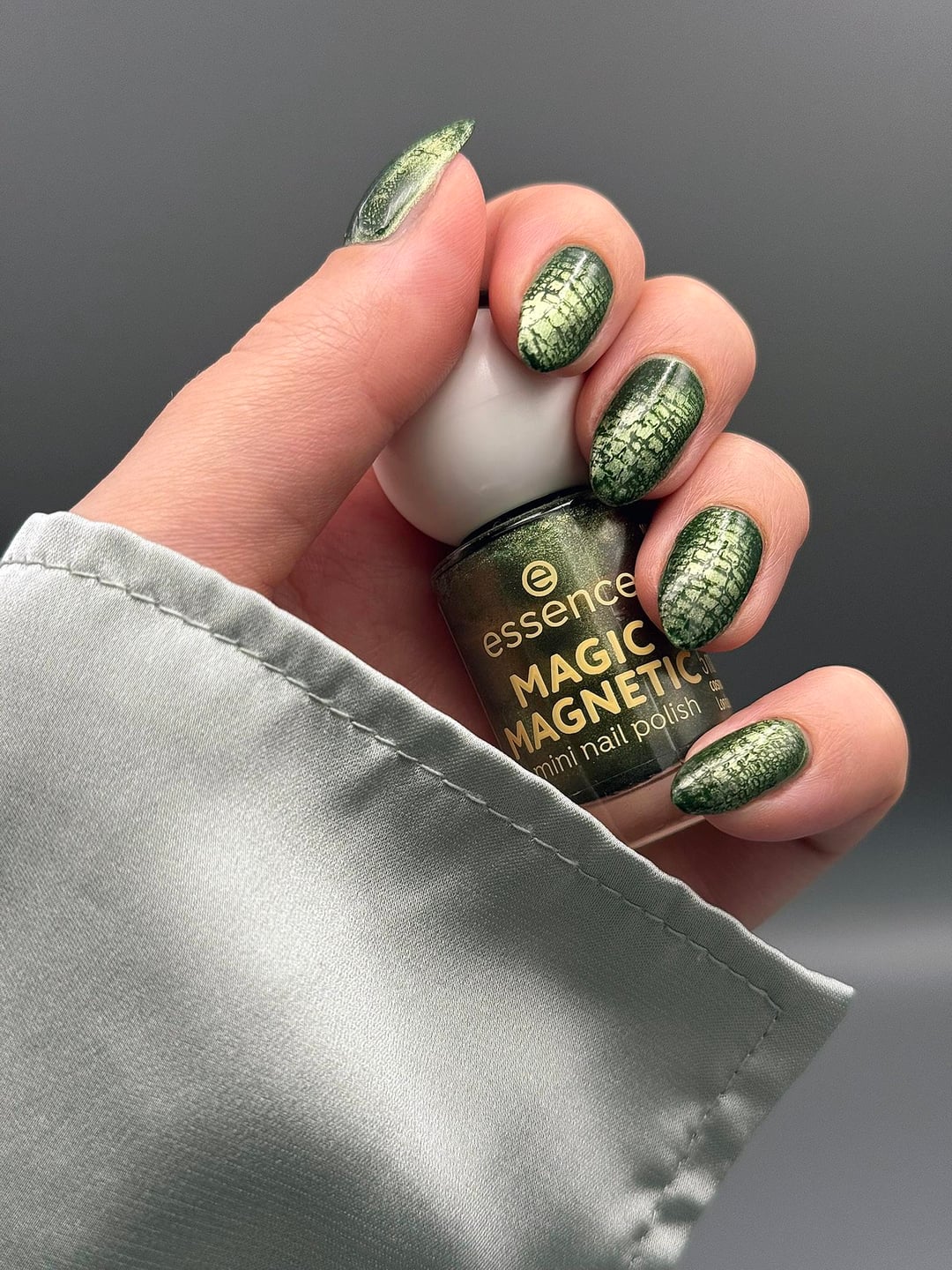 So this polish has a special place in my heart, because this is the one that introduced me to the world of magnetic finishes for regular lacquer! Before seeing it at the local drugstore, I did not know that we can also have fun with magnetics, I thought it was the priviledge of gel users only 🤭 Anyway, this polish costs about 1 EUR! 😲🤤 Of course, can't expect it to be as reactive as the indies, but I quite like its effect, plus it's a gorgeous color. I don't know why this may be, but perhaps some of the more scientifically inclined amongst you could answer: I felt during the application that this polish reacts more strongly to pushing than pulling. Idk why. So on most of my fingers, you will see I tried to pull a classic cat eye, but it is rather dissolved. On the thumb, I did an ombre instead by pushing the particles which felt somehow easier…?