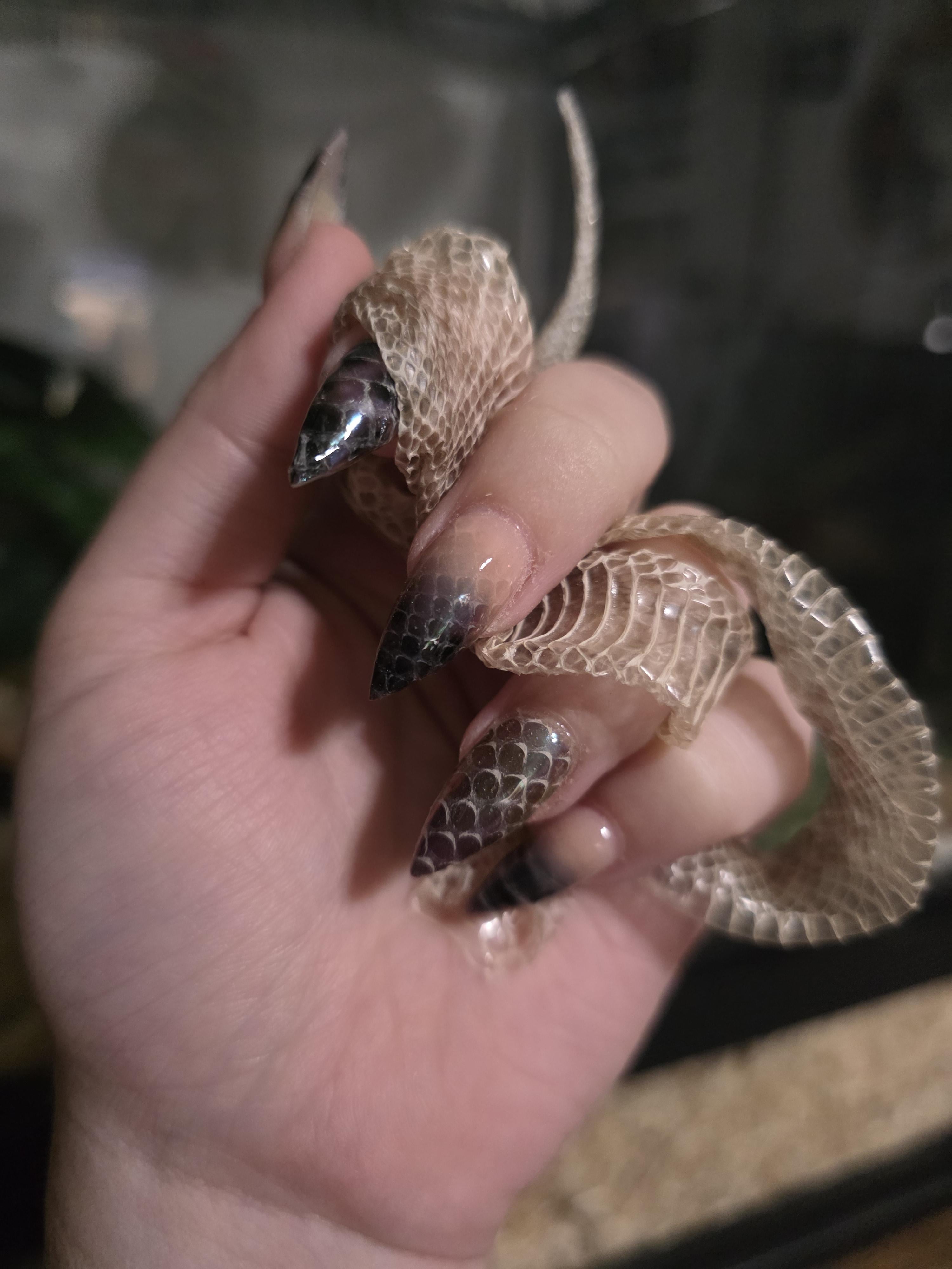 My artist's first time encapsulating shed snake skin into acrylic/gel We added chrome and an ombre for a little spice by JSqueaks
