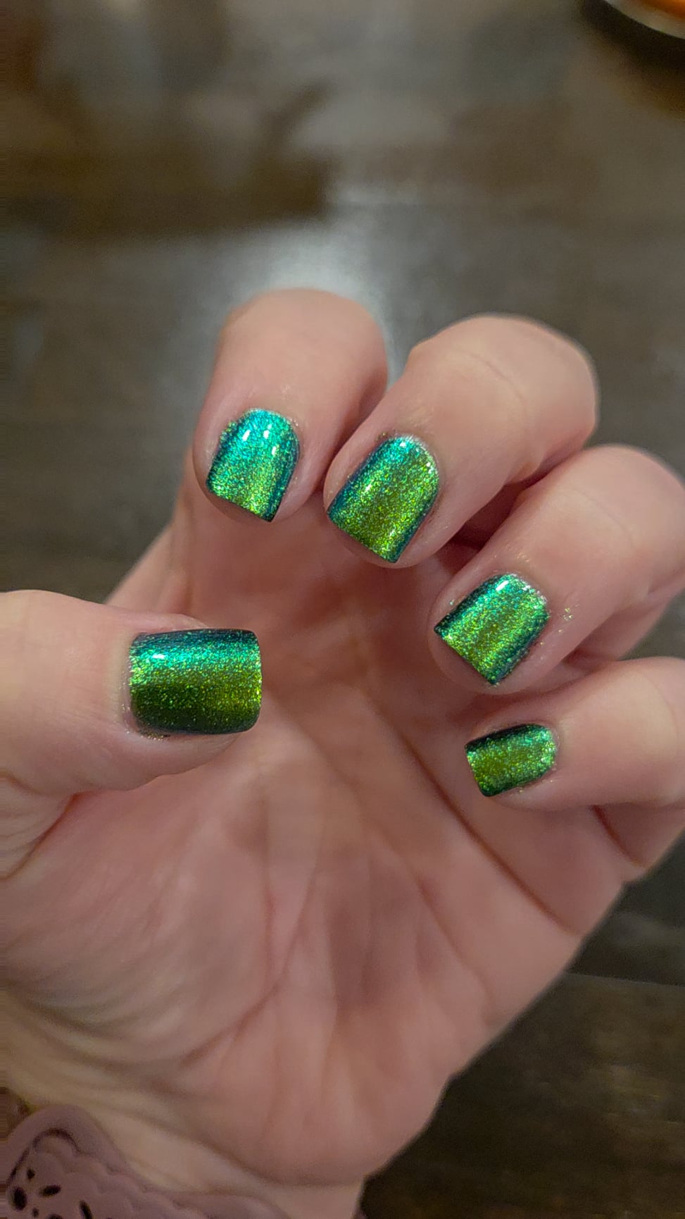 Color is 2 coats Serpents of Eden from Mooncat. My base coat is Hardcore Base Coat and Speed Demon Topcoat, both also from Mooncat. I ordered during the sale, and this is my first time wearing this color!