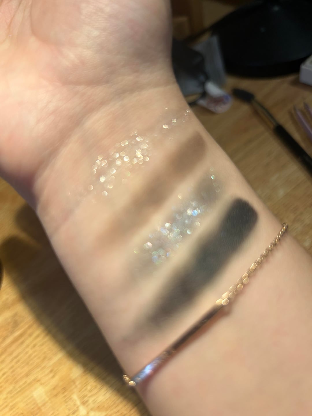 1. a scattered silver sparkle with no base— a lot like the fenty diamond bomb highlighter in appearance but more silver than white