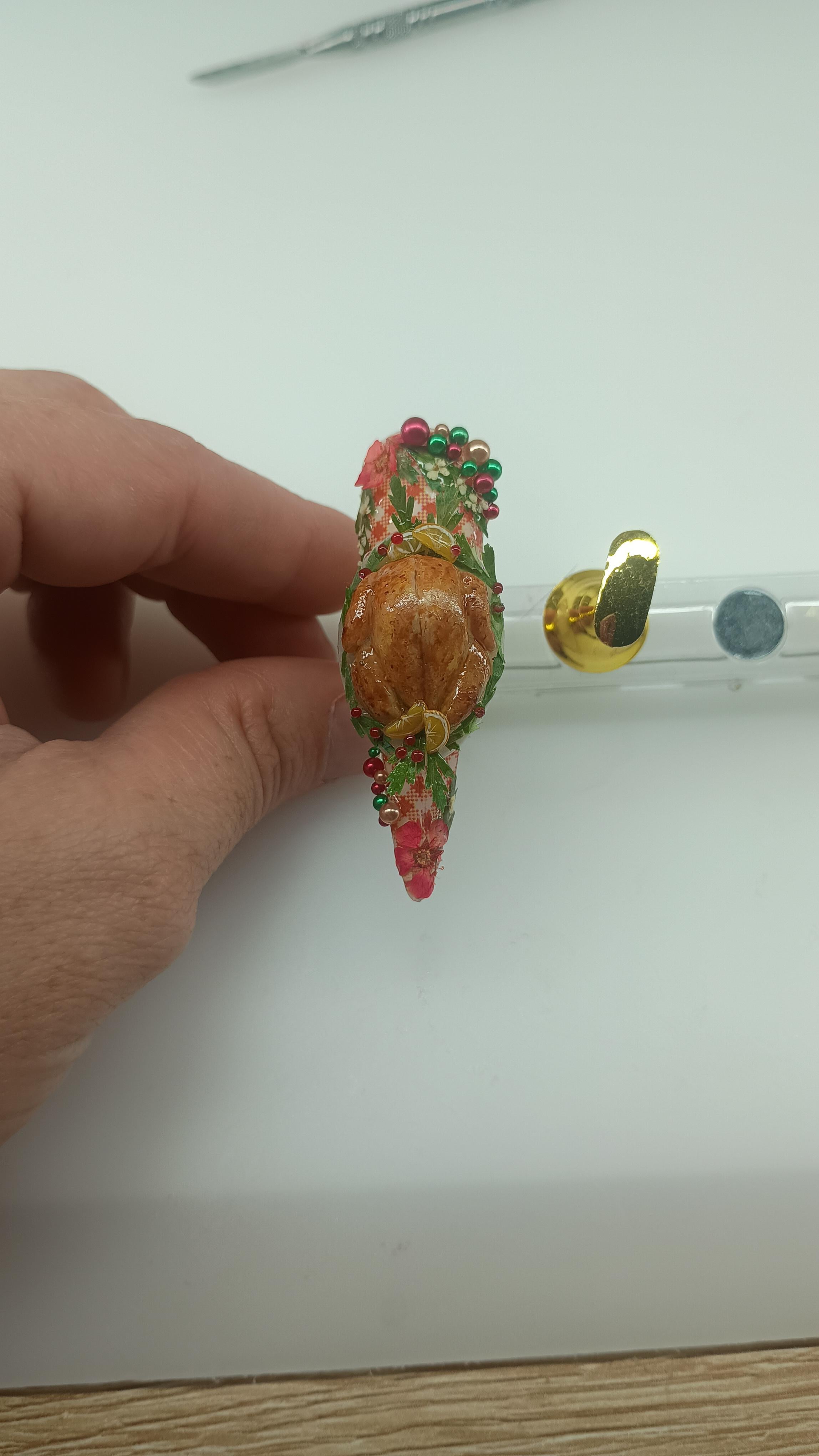 My sculpted and painted Christmas turkey with sliced orange and cranberries.