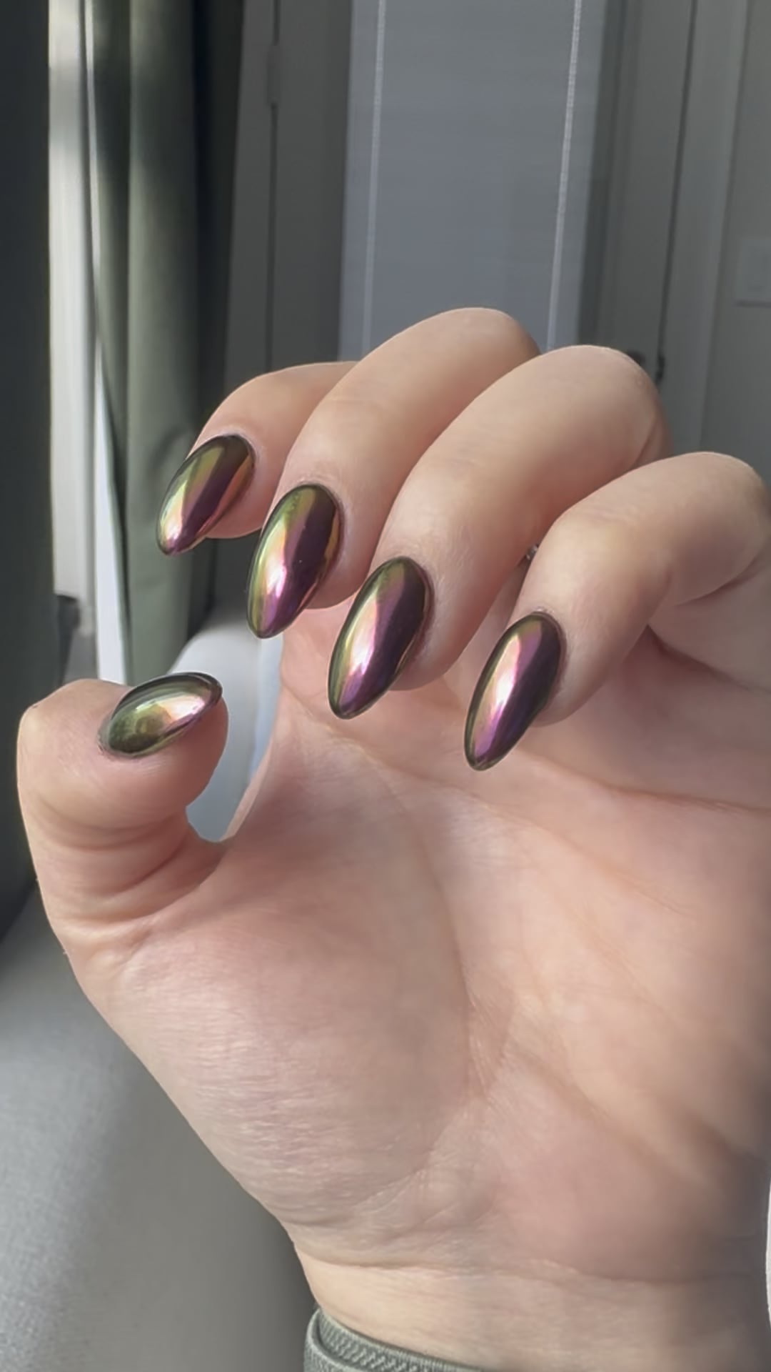 Haven’t done this chrome before but I can’t stop looking at it 😍 This is builder gel w a DND base color in a dark maroon and DND top coat with the chrome by mymymy58