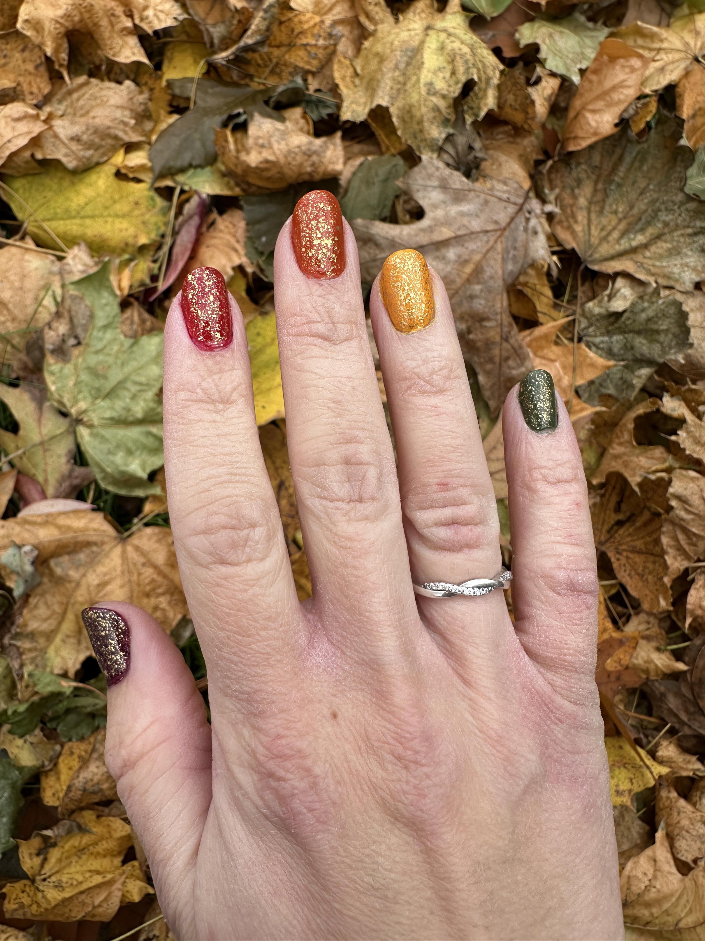 DiligentPenguin16 on November 16, 2025 5:55 pm Essie Here to Stay basecoat Sally Hansen “Zip Wine” Sally Hansen “ASAP Apple” OPI “Suzy Needs a Loch Smith” Essie “Outside the Lines” Essie “Heart of the Jungle” Mooncat “Fool’s Gold” topper Seche Vive Gel Effects topcoat
