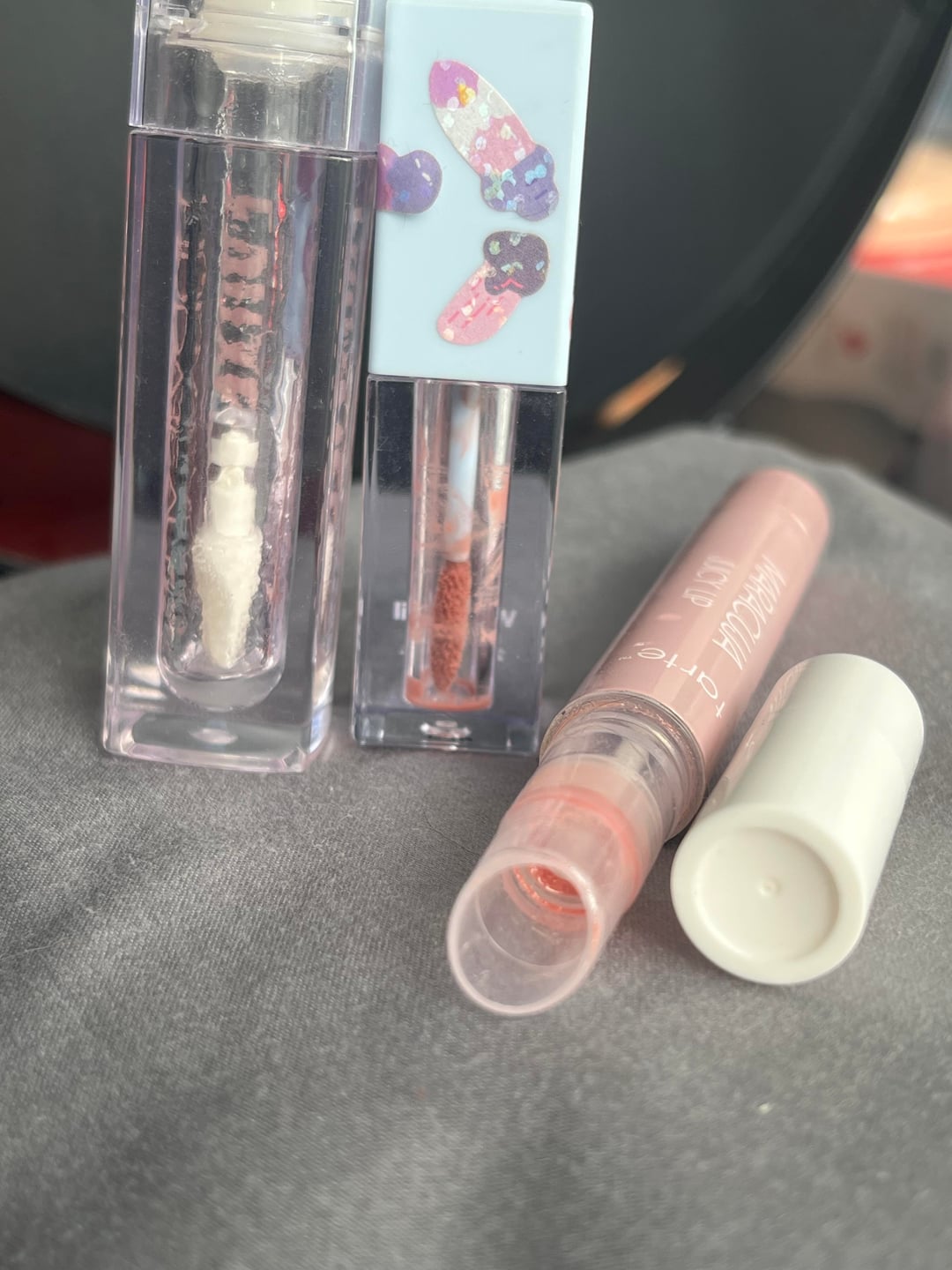 Huda Beauty Faux Filler Gloss in Glassy, Mini Kosas Wet Lip Oil in Unbuttoned, and Tarte Maracuja Juicy Lip in Orchid I think?? The cap label came off ๐Ÿ˜ญ