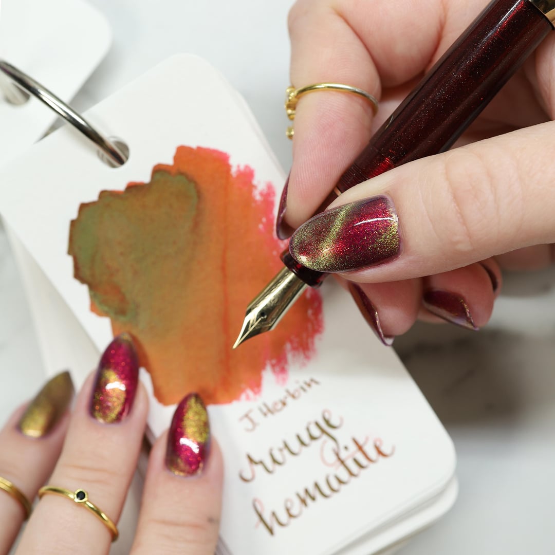 - J Herbin, Rouge Hematite – Alas, though I had high hopes with the green sheen and the gold shimmer in this ink, the red base is too saturated and not dark enough, so also a no.