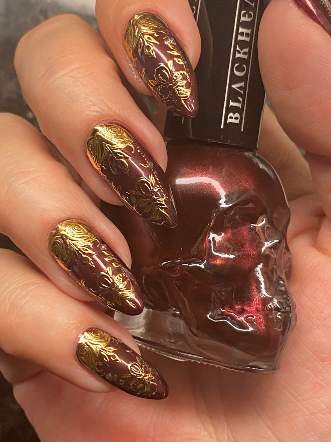 I was wearing one of my favorites, a one-coat-wonder (Blackheart- Enemy Blood), when I found these stickers next to a set of press ons that are the same shape, length, and basic color as my own nails! It was fate.