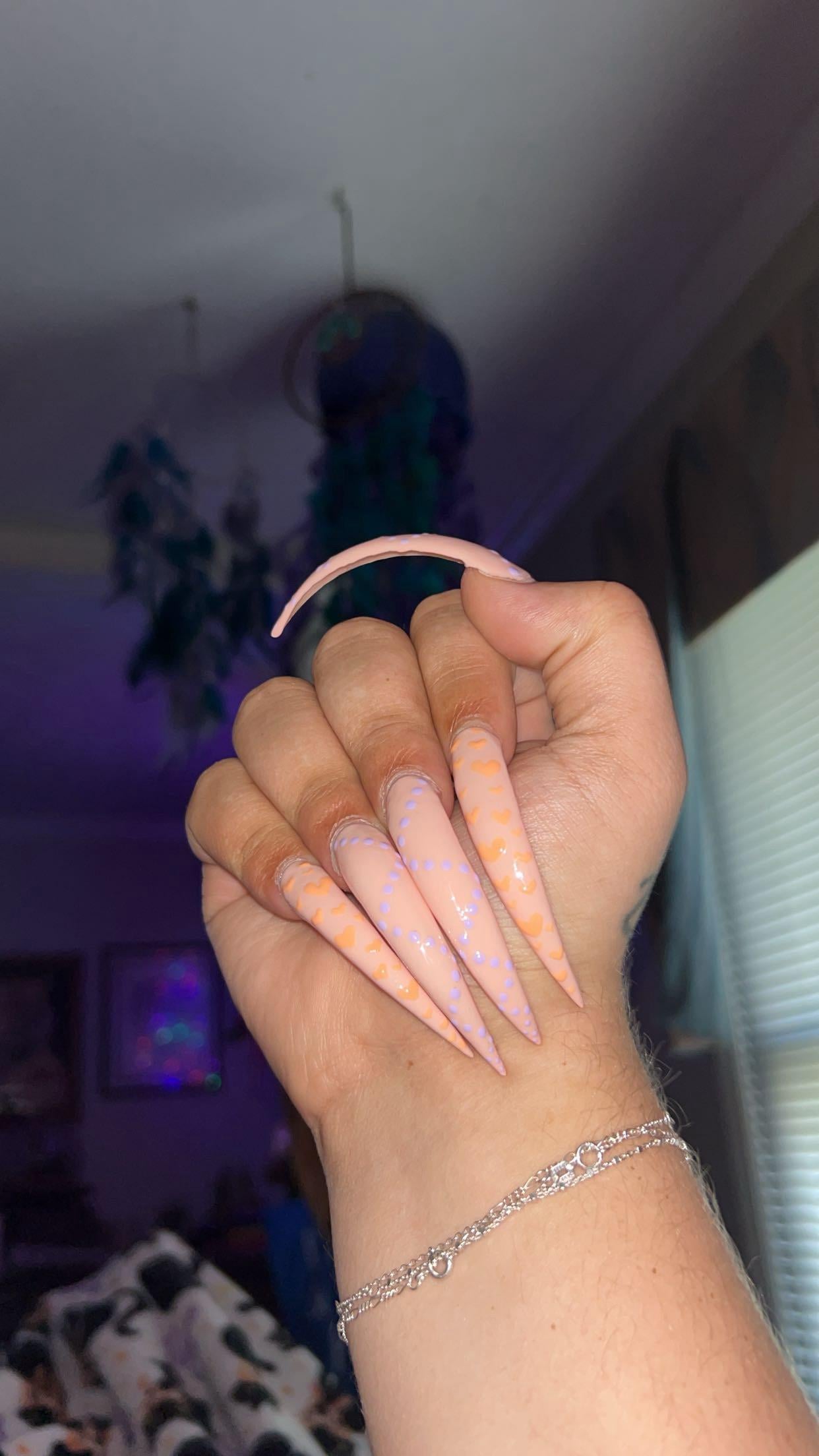 Hey, I have a question for you… How do those feel on your nailbeds? Do they feel strong and balanced? They look thinner, more natural than mine. I’ve been doing long, straight stiletto on myself, and i need to make it kind of thick on the top third, to make sure they don’t feel like they’re gonna get pulled off. But I’ve really been considering trying out curved nails because the shape looks more natural, like it probably creates a more natural comfortable balance.
