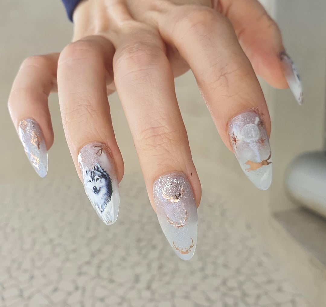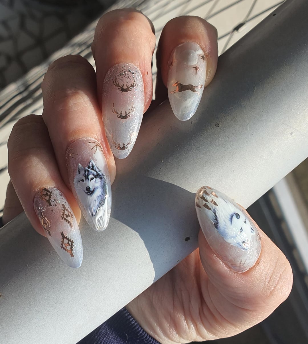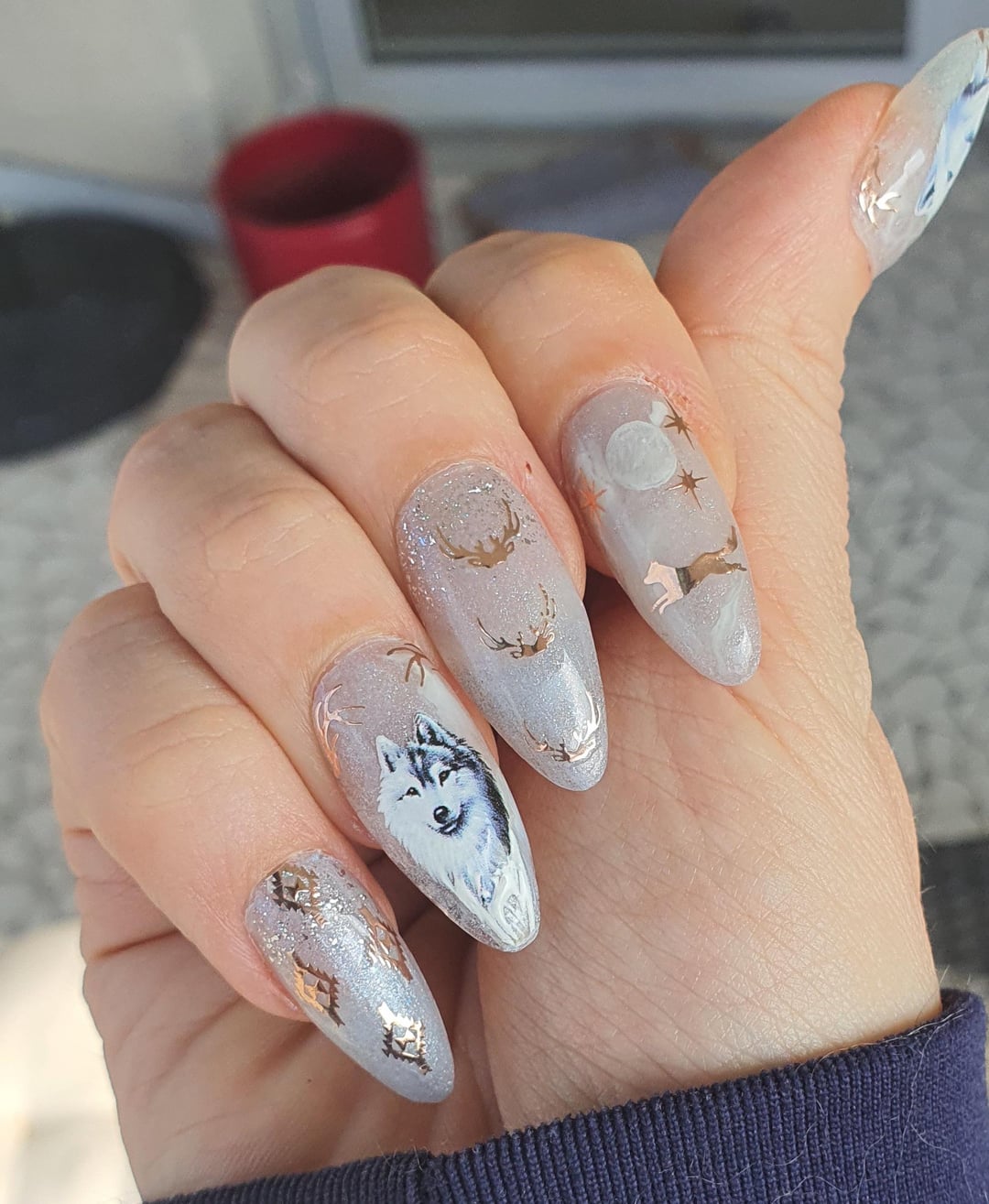 For this set, I used : – gel polishes : white, ice blue, silver glitter – rose gold stickers and wolves stickers Glossy top coat by Key_Opportunity_7082
