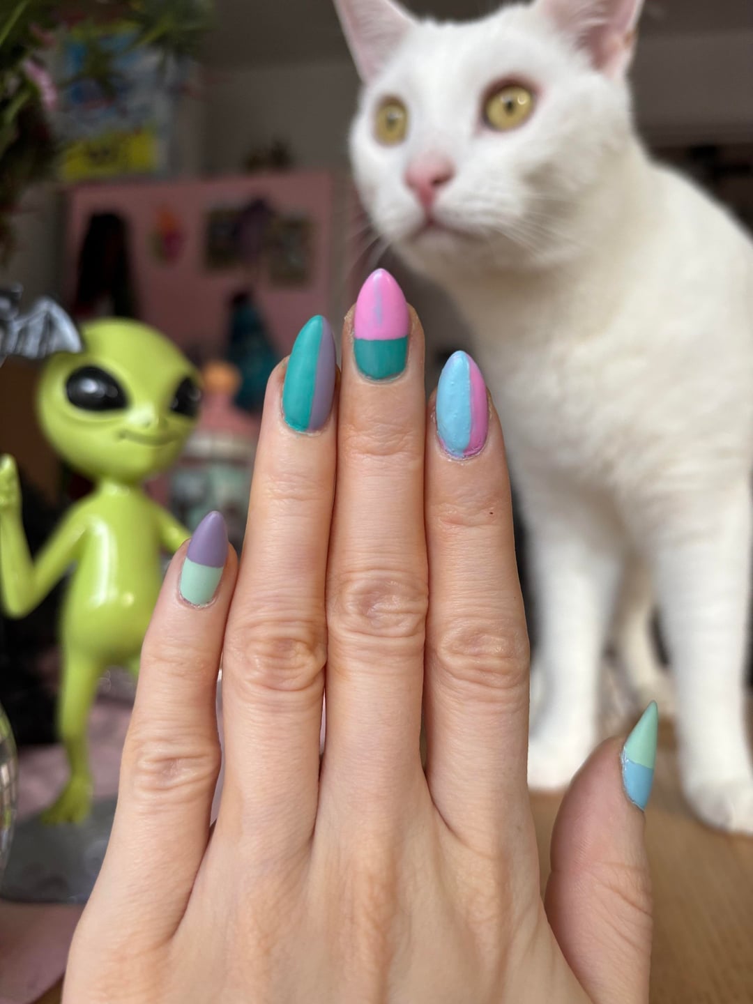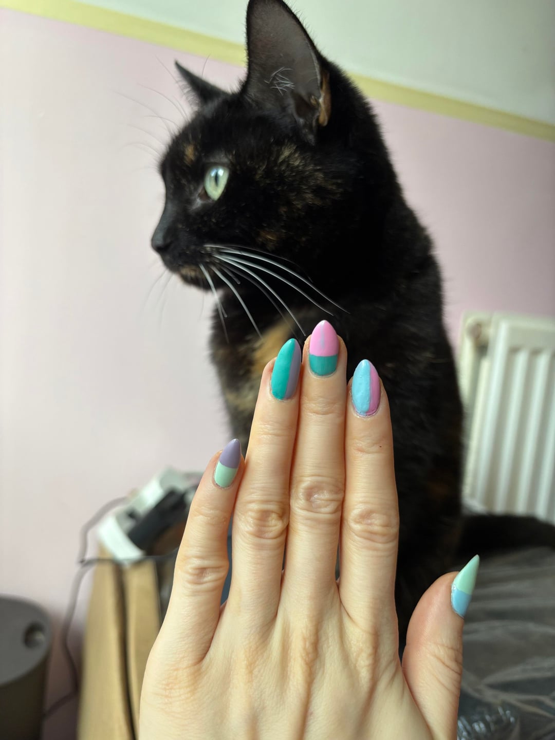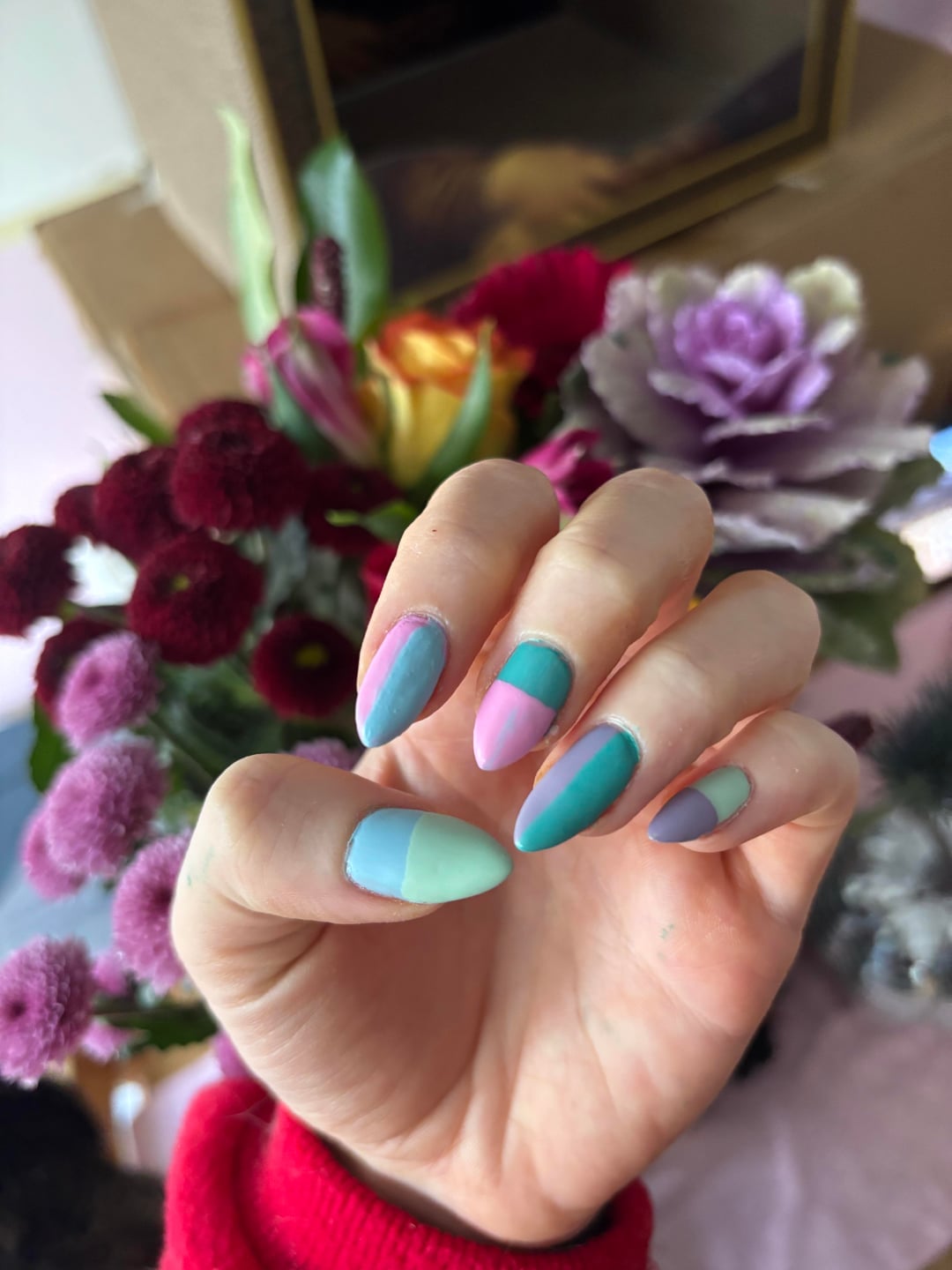 I was impatient and applied the top coat too soon so I have colour streaks and had to make the blue half on the pointer finger, thicker due to a particularly egregious mistake. Overall, deffo came out better than the first time I tried to do this mani! It's freehand and I haven't cleaned up yet, but I don't mind that it doesn't look professional.