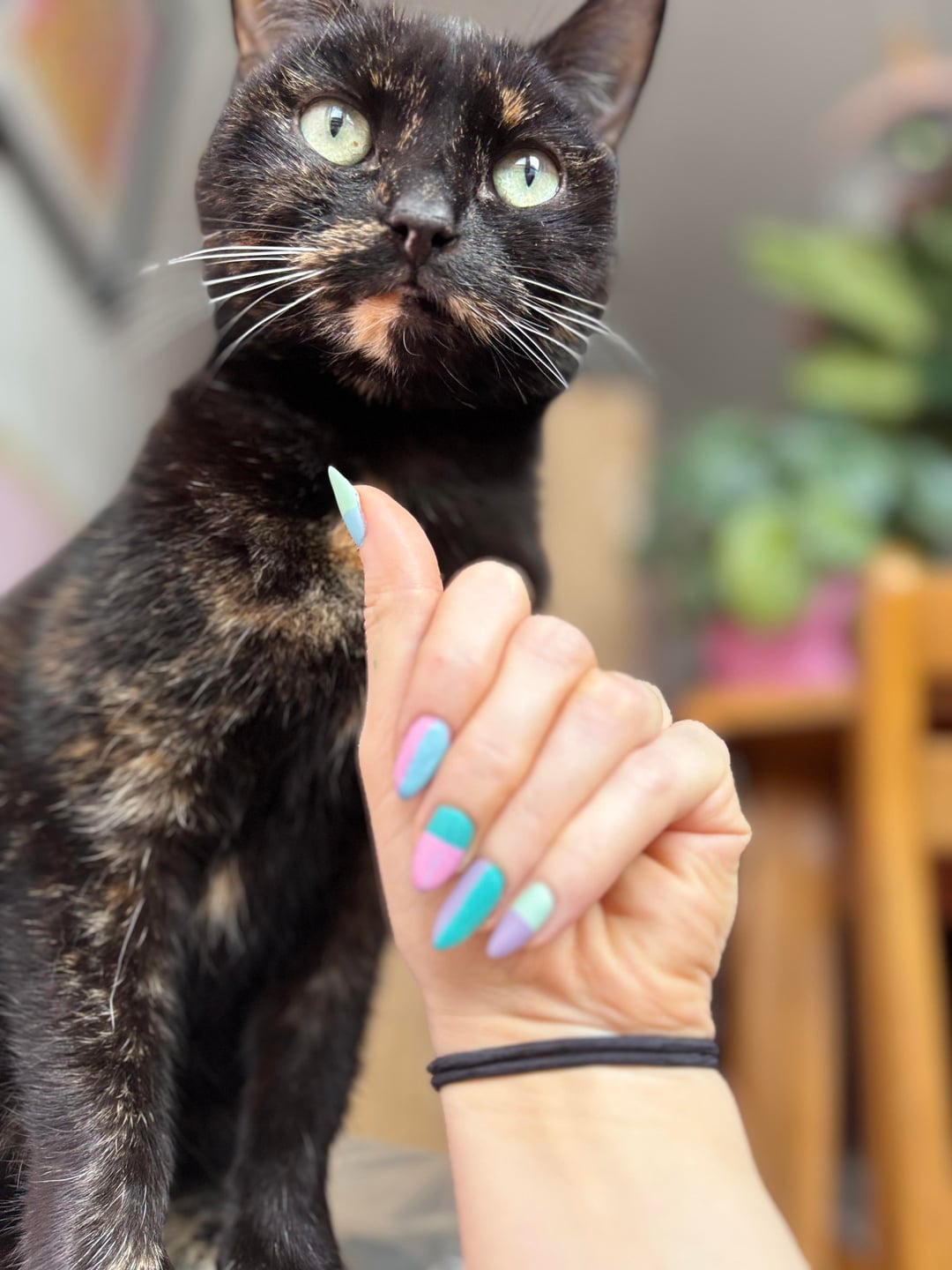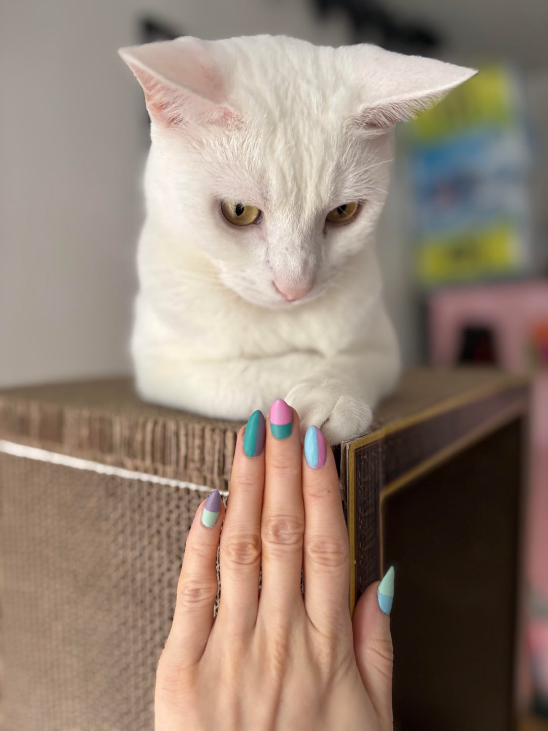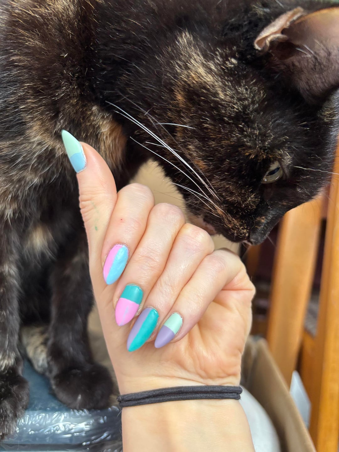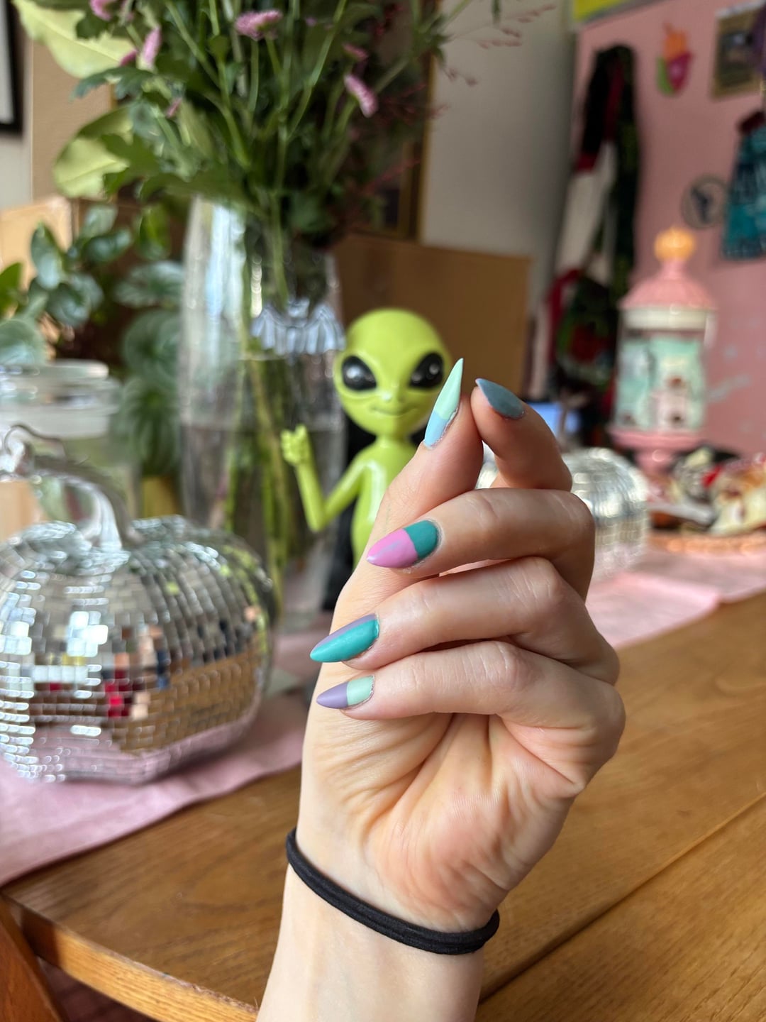 I was impatient and applied the top coat too soon so I have colour streaks and had to make the blue half on the pointer finger, thicker due to a particularly egregious mistake. Overall, deffo came out better than the first time I tried to do this mani! It's freehand and I haven't cleaned up yet, but I don't mind that it doesn't look professional.