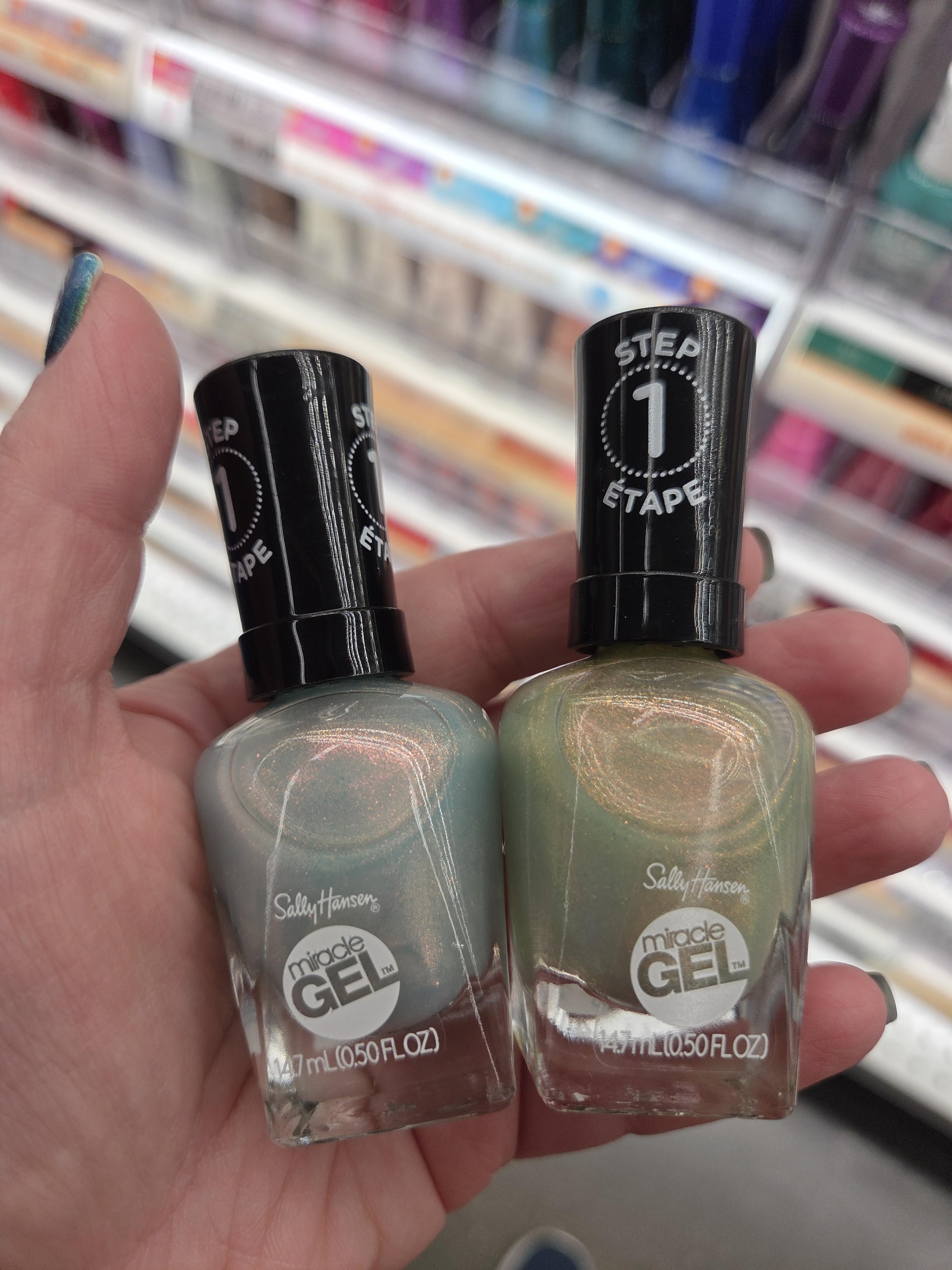 I don’t have this one specifically, but it’ll be the one on the left with the bluer base and pink shimmer! Seems like it might fade to green over time [according to this post from a year ago](https://www.reddit.com/r/RedditLaqueristas/comments/1evij73/two_different_colors_for_lets_get_digital_sally/)