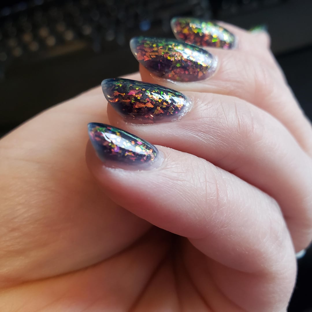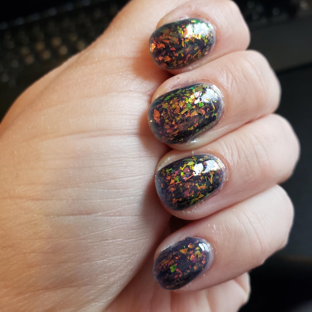 Even with mega flakes this polish applies really well! I did not have random flake corners sticking up or poking out at the free edge or any of that. 🥰
