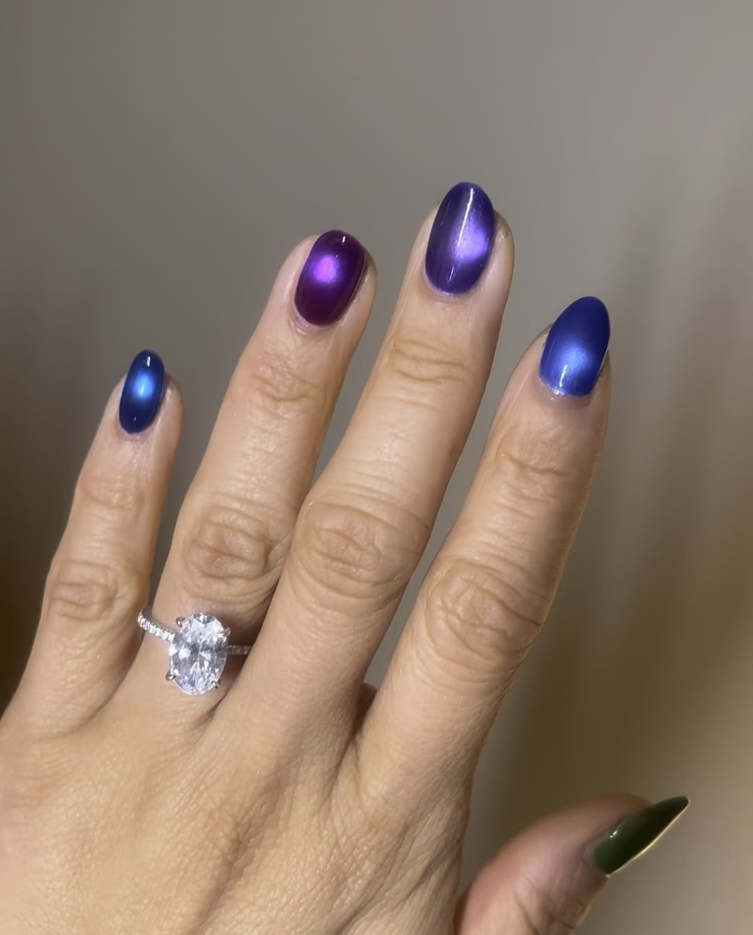 I had a skittle with the lab stirrer glass bead method of fine particle magnetics with two coats of BKL It Happens on thumb, Penelope Luz Myosotis on index, BKL Gift of Divinity on middle, Penelope Luz Wisteria on ring, and BKL Choo-choo on pinky.
