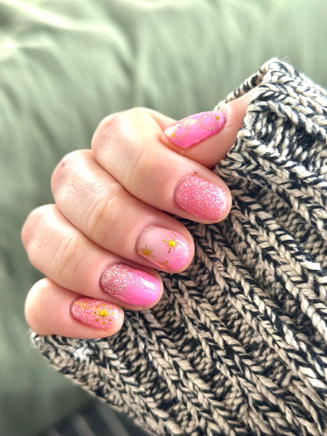 Tried my hand at some ‘Wicked’ themed nails! Products Used: • Beetles Top & Base Coat • Beetles shades b072, 28, 30, 841, 840, 253, 254, & 842 • Gold celestial decals from Amazon • Born Pretty Mermaid Flake by cassiepayne