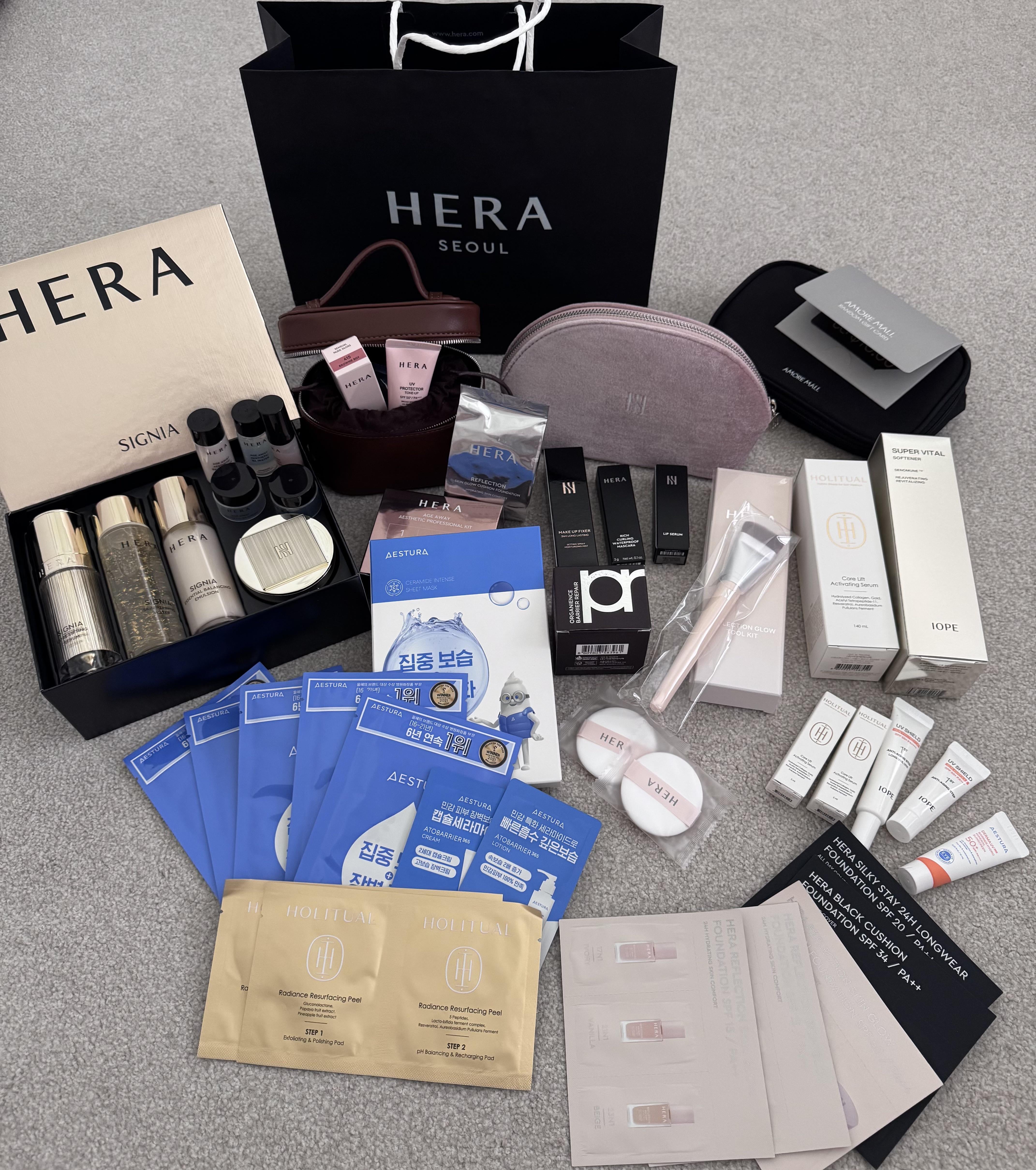 • Hera makeup pouch which has all Hera product samples for their cushion and foundation, makeup primer, mascara and lip serum and foundation tool kit.