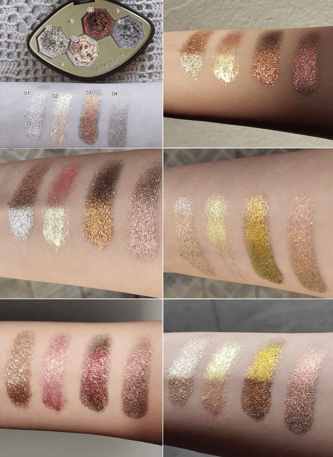 I tried to get different lighting but swatching eyeshadows is hard!! second to last picture is a comparison I did of the girlcult face palette and the joocyee eyeshadow palette because joocyee's actually was the first eyeshadow palette I seriously searched about and bought when I got into makeup last year (after spending my teen years only buying those extra cheap ones you find at stores where they also sell beach chairs haha).