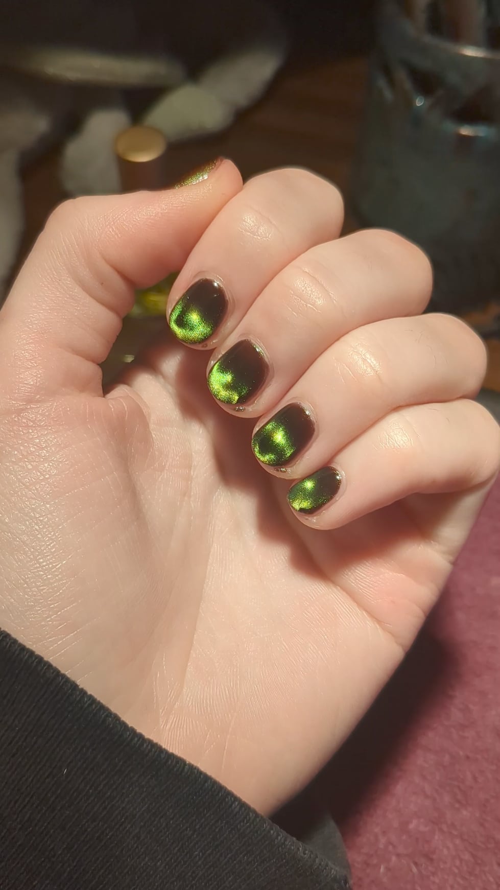 i tried the “mini glass bead” technique where you make a super small bead and then let it naturally disperse. but i think i might not have magnetized the top coat long enough? or maybe was a bit sloppy in capping my edges because there’s magnetic pigment concentrated near my free edge. the result is cool in its own way but i seriously have no idea how y’all are doing this so flawlessly it’s frustrating me 😭