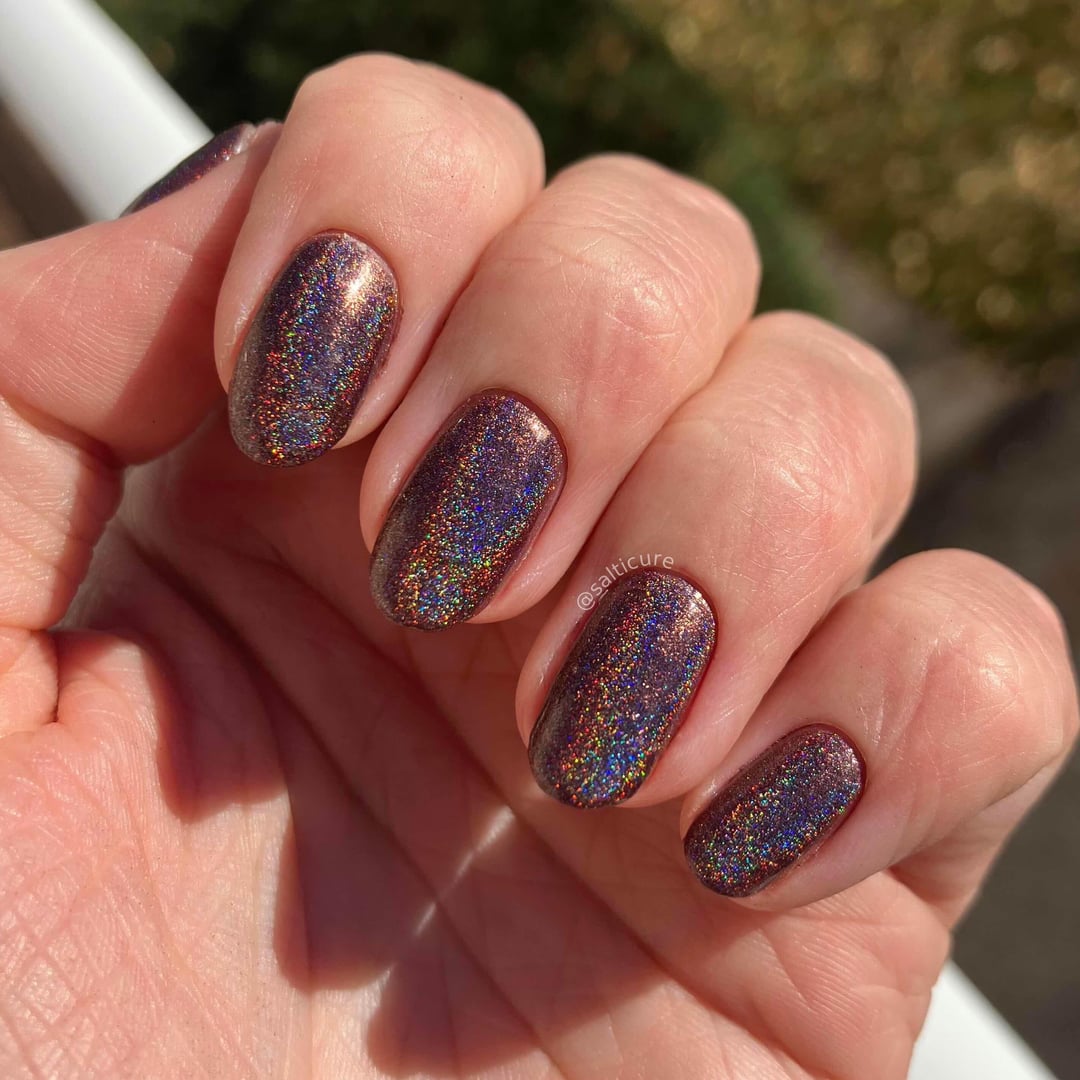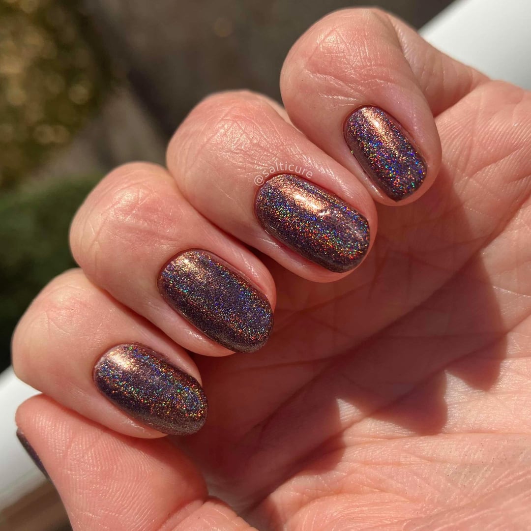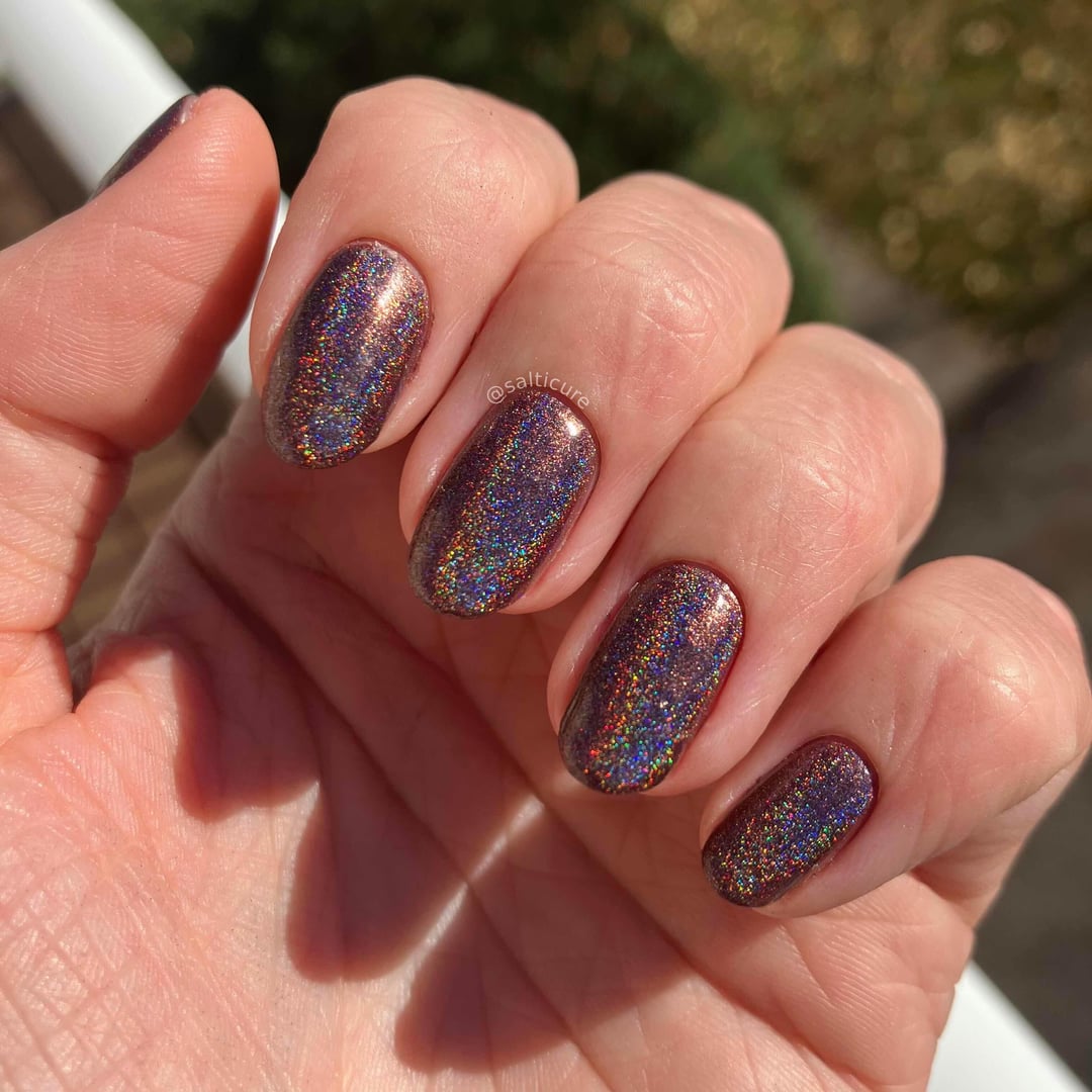Wearing one of my untrieds. Mooncat’s Boa Constrictor was super lovely on the nails in 2 coats. I love brown. I love holo. I love brown holo. Normally office lighting is king, but nothing touches holo in the sunshine. by Salt-Knight