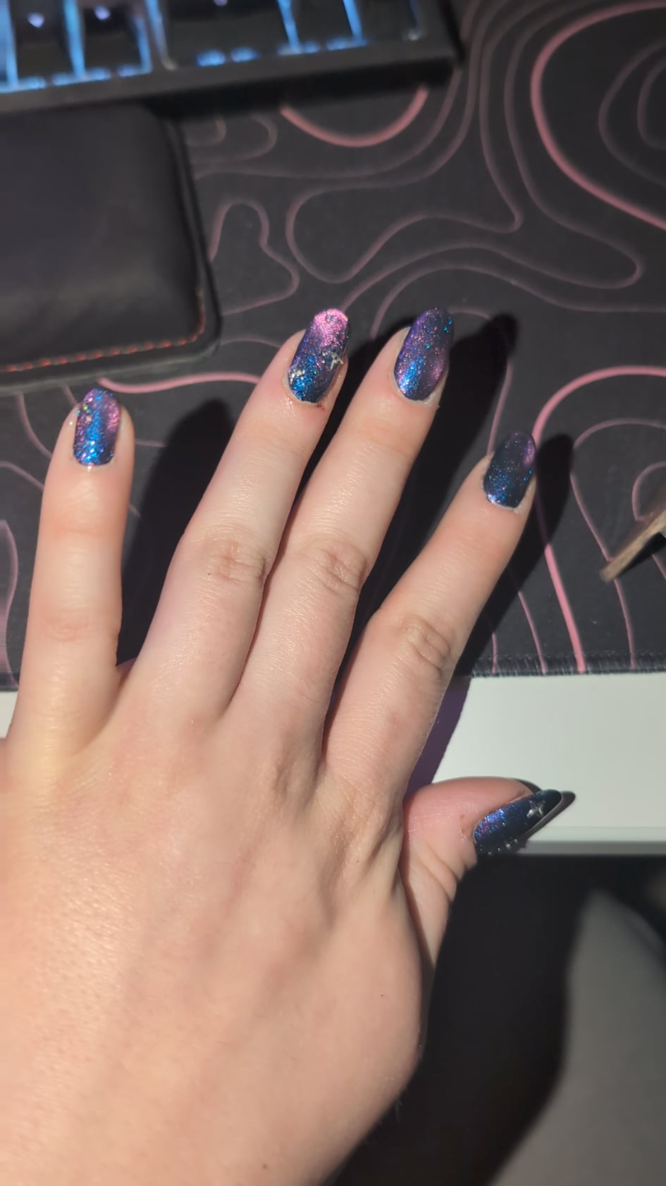 2 coats Holo Taco smoothing base, one coat each of Sally Hansen Midnight Drive and Holo Taco Cool Cat Mom, one coat Glossy Taco! by s_decoy