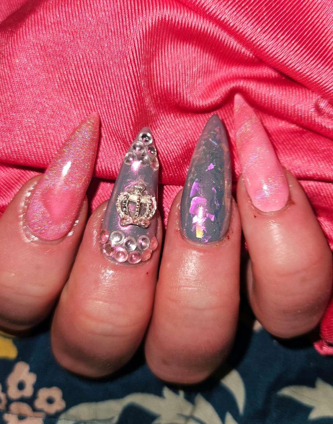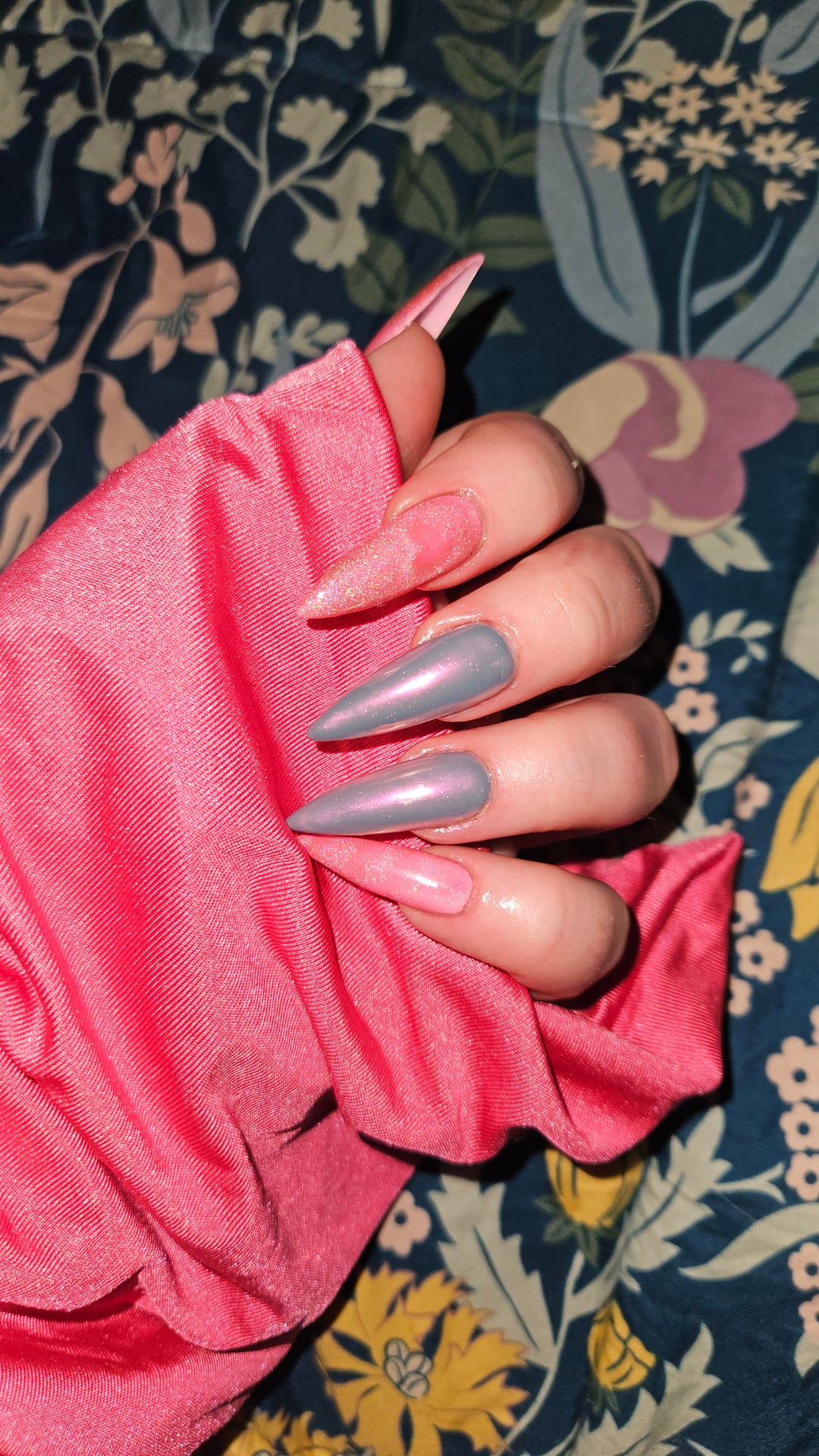 As the title says, this is my third ever DIY set. I have completely fallen in love with doing my own nails. Please ignore the cuticles on my right hand. The skin on that hand in general is terrible and beaten up overall from my dog slamming my metal from door on it, not because of doing my nails. I also have cuticle oil on so everything's a little shiny, and may easily be mistaken for clear gel polish on my skin but there is definitely none! I love how these turned out, and will probably decorate the two grey/pink chrome powder nails in a similar way to the two on my right hand as I only left them blank because I wanted to watch a movie with the hubs, so I stopped and put everything away.
