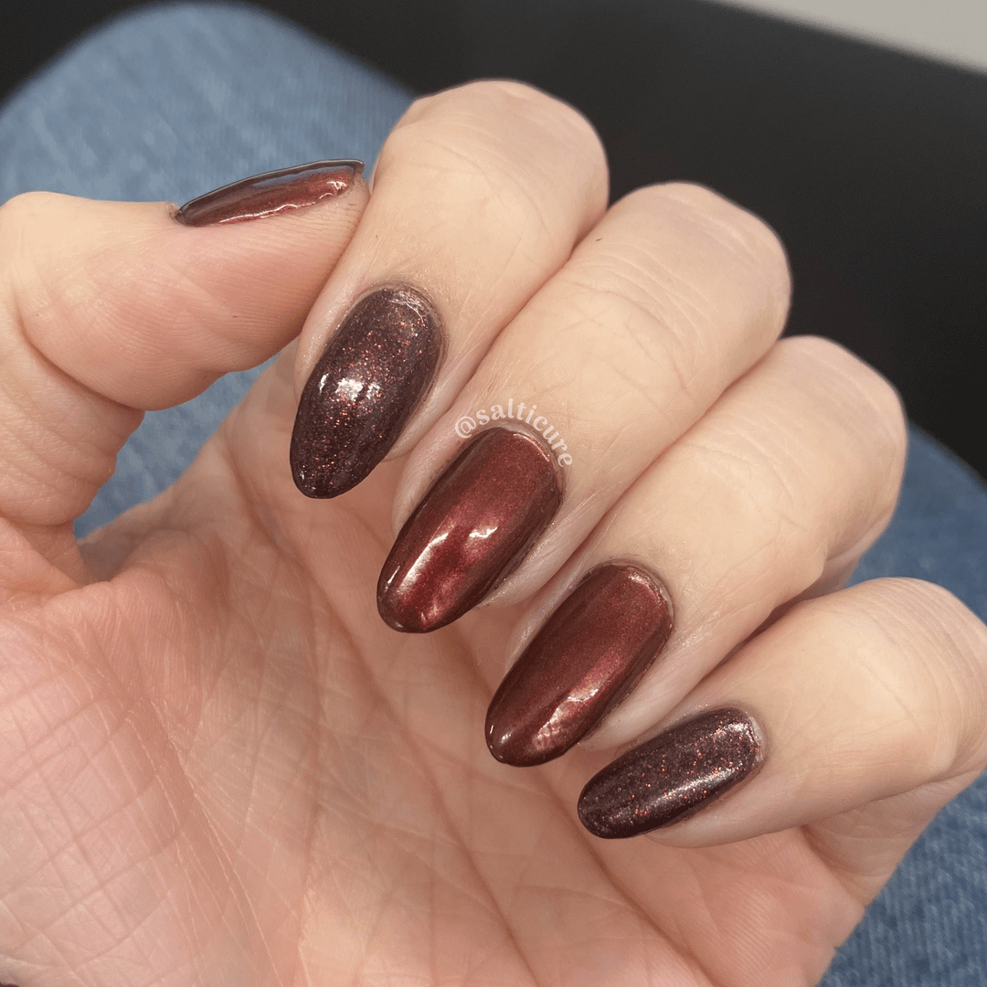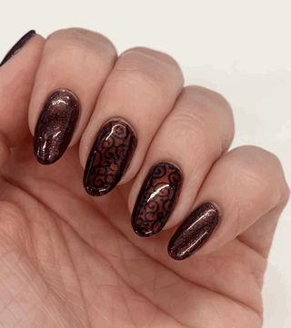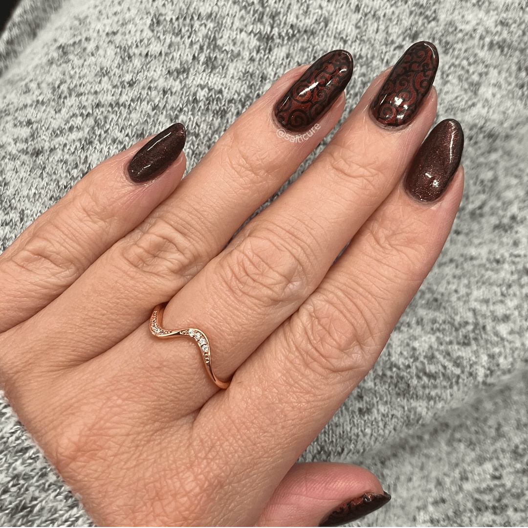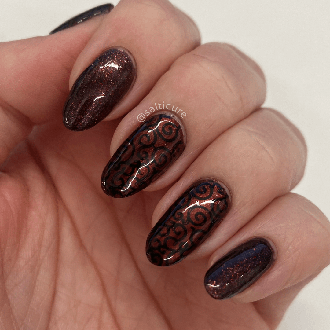 I wore this mani without the stamping for a few days (which was still beautiful. Pictures at the end.) But then I was overcome with the desire to stamp! I love the way the swirls look over the shifty red.