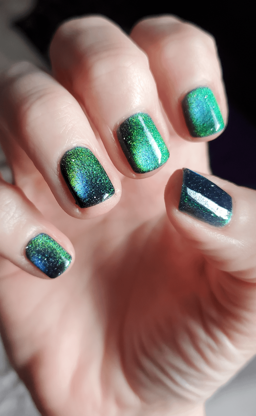 BKL Zoeystery at three coats. Nailtek Strenghten II as my base and Holo Taco Glossy Taco as top. I put my 30 lb horseshoe on top of my 5DPRINTFACTORY glass bead spinner for the first time (shout out to whoever recently mentioned that – sorry I'm too lazy to look up your username but def holla if it was you 💕). I decided to see if I could get a better bead with longer spin times. I magnetized the 2nd coat of polish at my standard 60 seconds. For the 3rd coat of polish and the top coat I did 2 mins each (which honestly felt like an eternity). Not sure. I can't say I notice a difference from my usual 60 seconds. Maybe a little bit? Slightly better bead? Anyway, always fun to experiment a little. The 30 lb horseshoe could be contributing to the overall outcome as well (also unsure).
