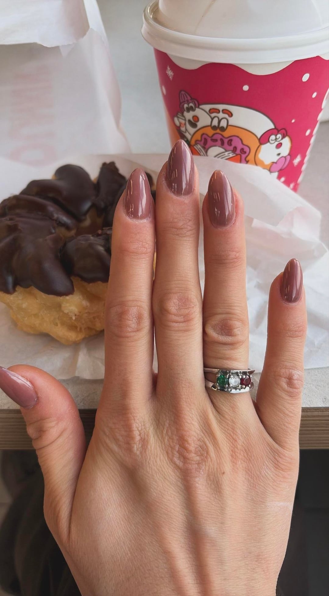 These are my nails that I had done at my local nail salon. The shape is almond, this is a UV gel manicure. The color was a mix of two DND gel polishes (a sheer pink🩷 and espresso brown🤎) I love how they came out. 🫶🫶