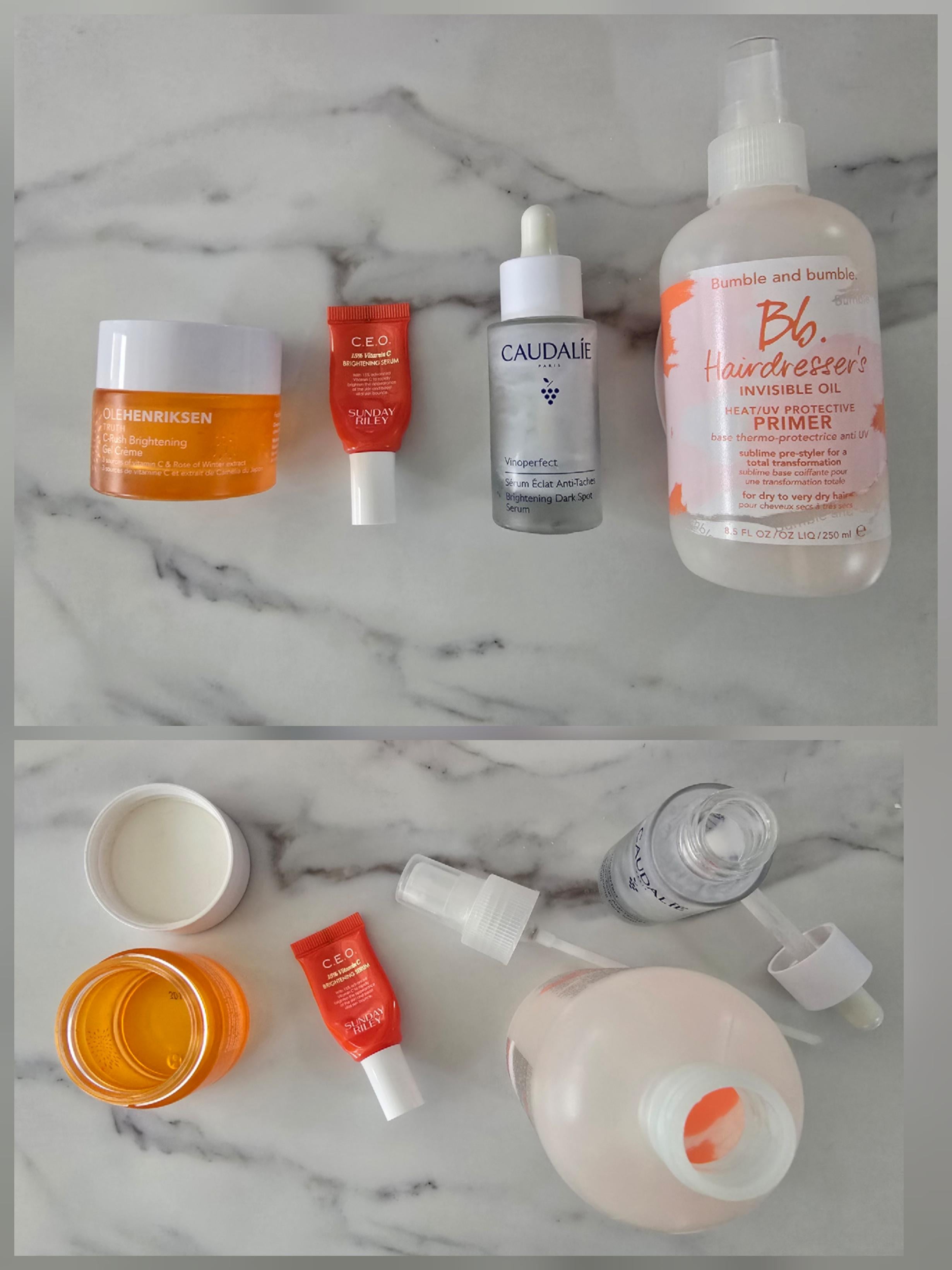 Ole Henriksen vitamin c moisturizer, Sunday Riley Vitamin C serum travel size, Caudalie Vinoperfect serum, Bumble & Bumble hair primer.
