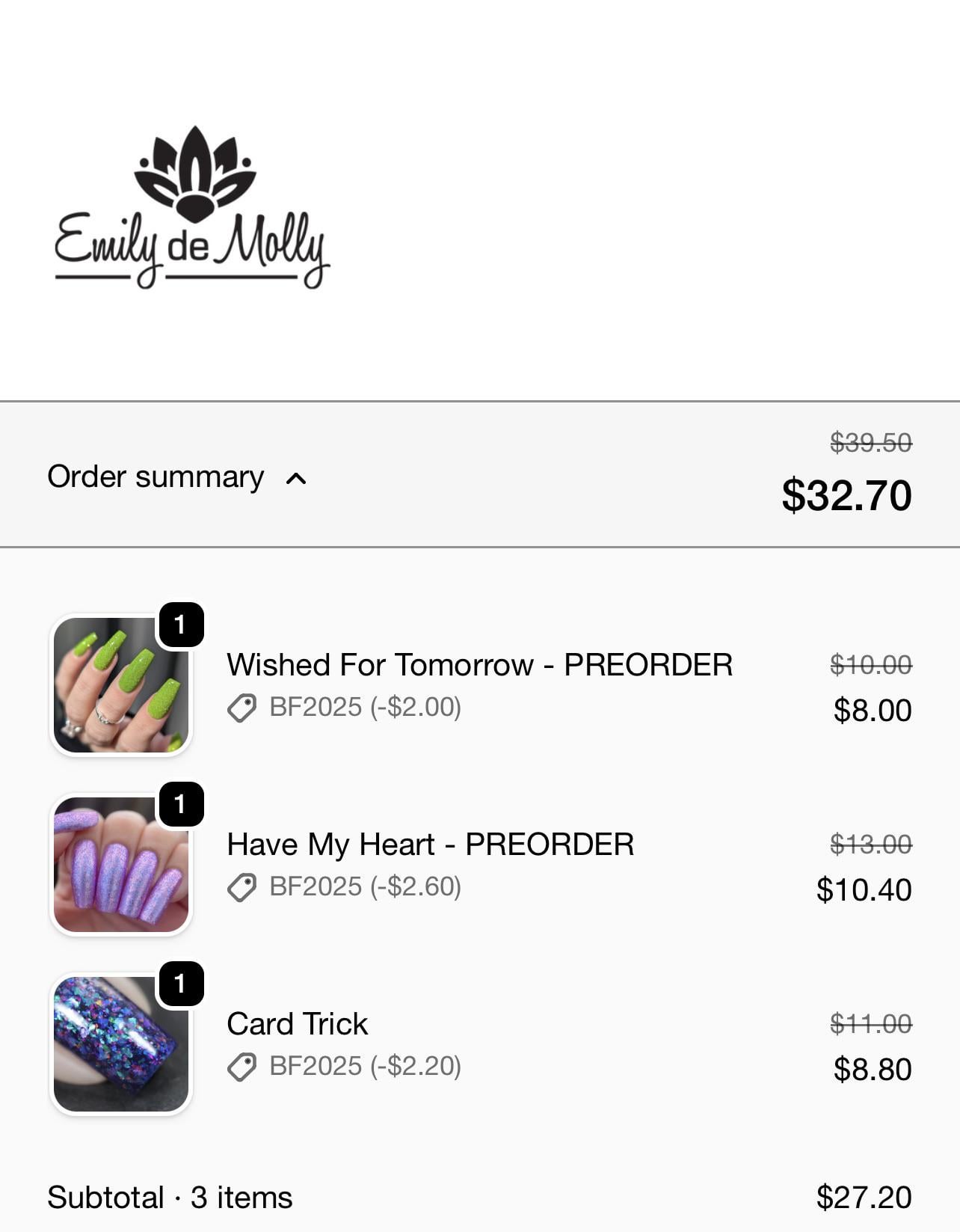I placed my first EdM order and I am very excited! I initially had 7 polishes in my cart but narrowed it down to these 3 and I am happy! I don’t think I will be buying polish for a while (I say that in case my gf sees this post hehe)