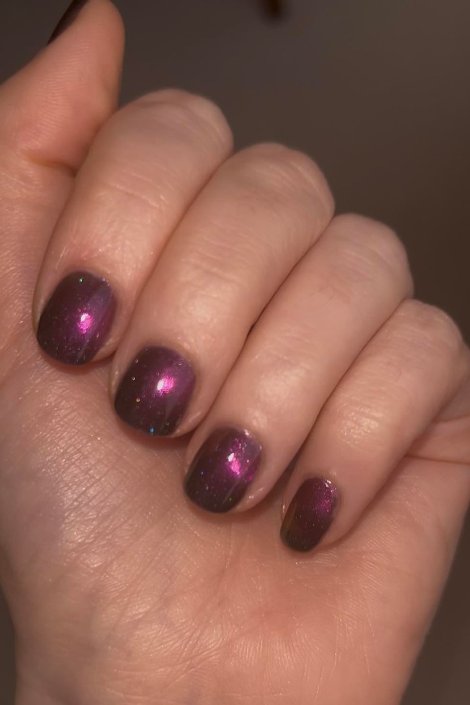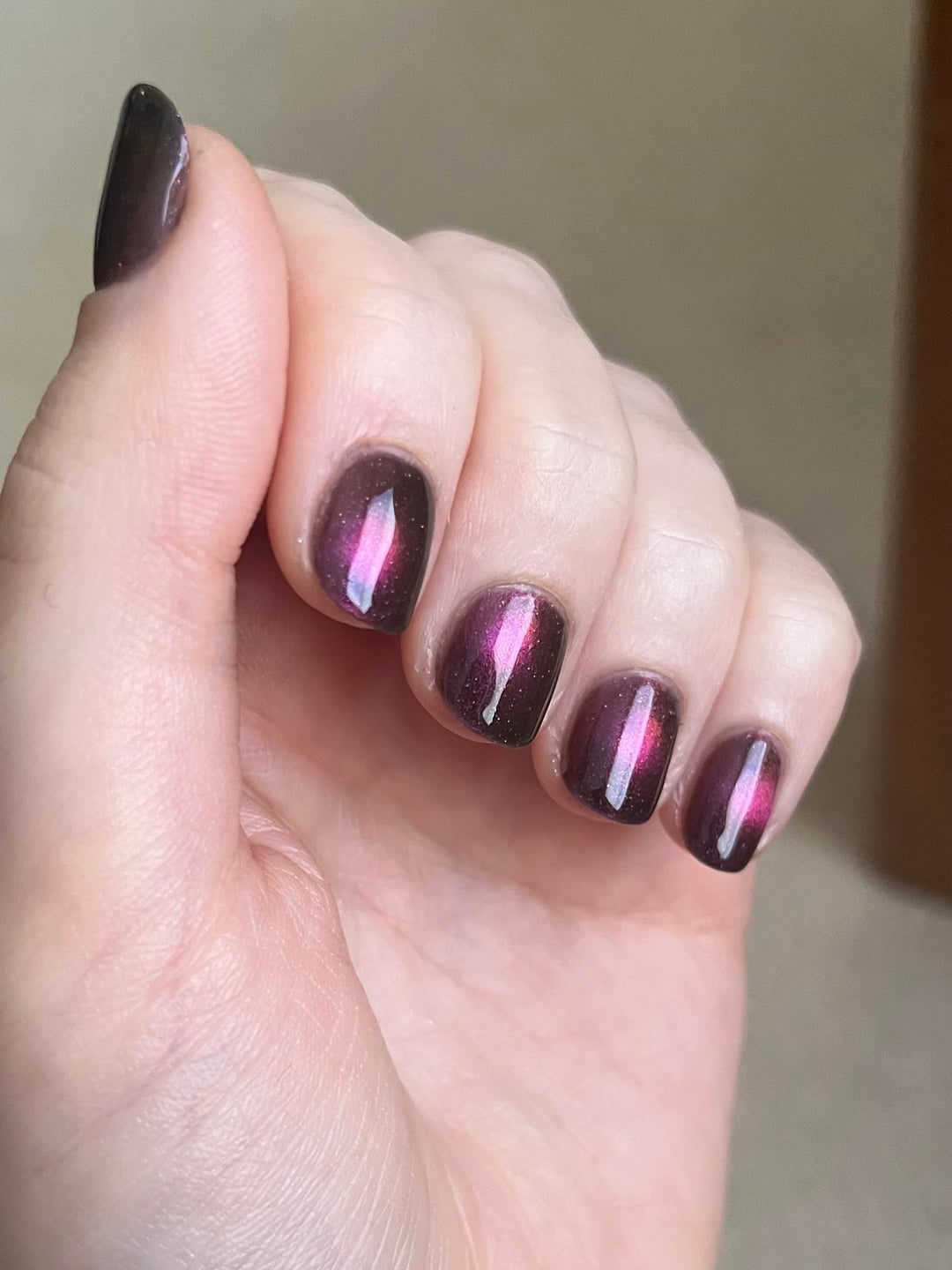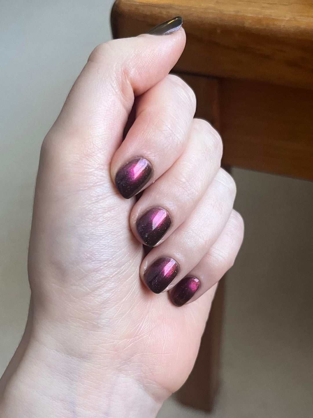 Love this polish from ANLAC and how versatile it is. Want to see more of the dark base? Wear it as a cat eye or a glass bead. Want it to look almost like a classic multichrome? Velvet style is your game. Last pic is a screenshot from a video with flash to show the delicate holo glitter.