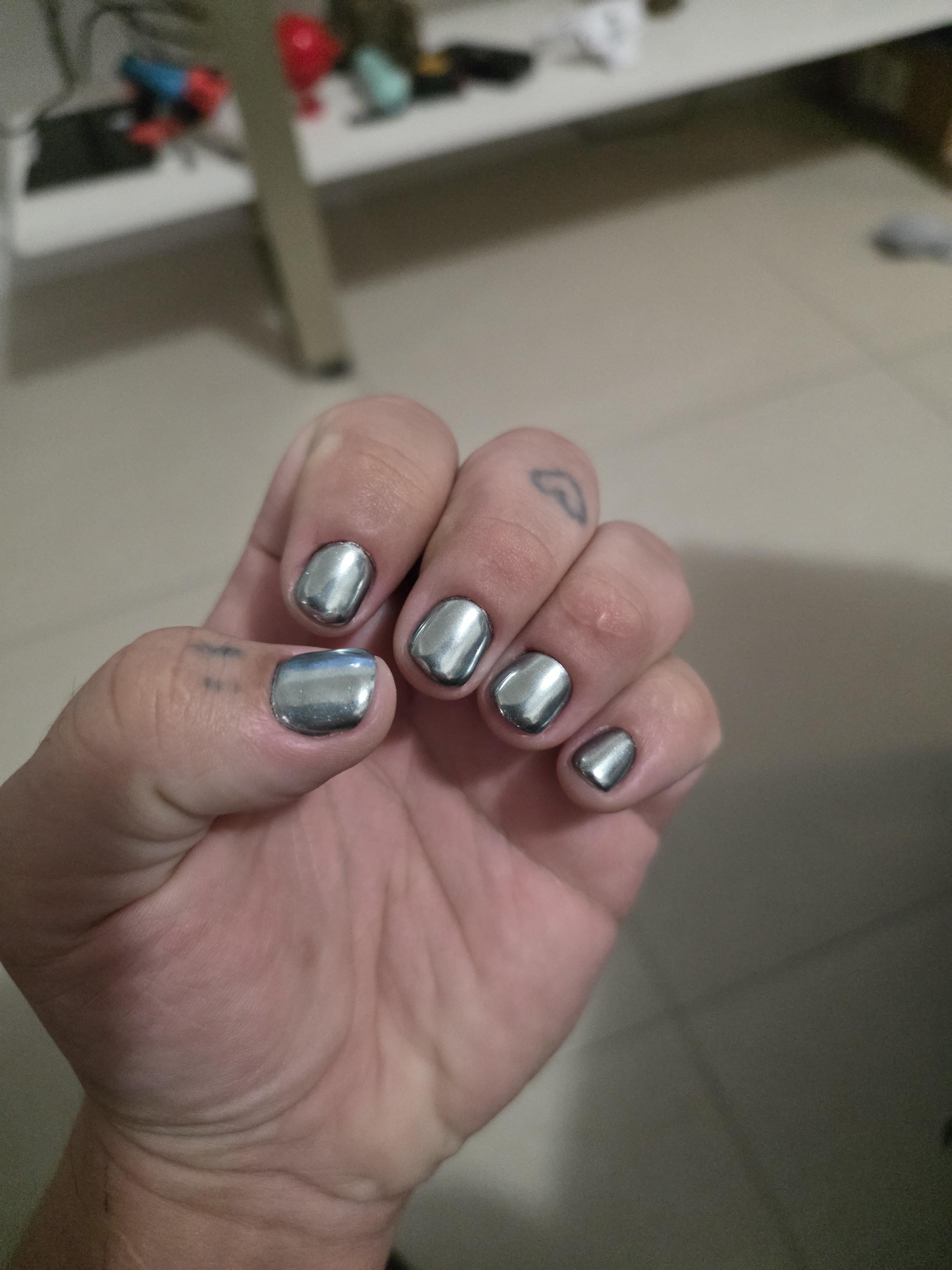 This is my second time ever getting my nails done. Last time I had a dark teal, which looked especially cool because they matched color of my faded tattoos. Unfortunately I didn't think to take pictures (of just the nails), but this time I remembered! I asked for chrome to match my piercings, and I gotta say they came out so cool! Shout out to my wife's lacquerista, Olga!