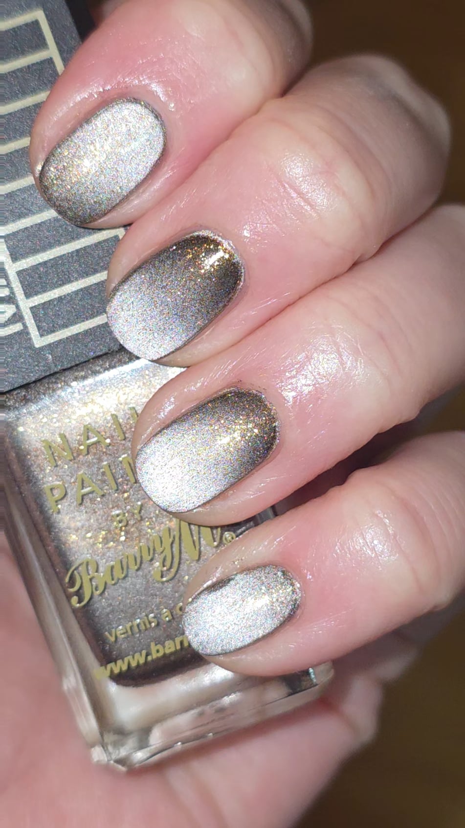 Barry M Gold Magnetic Sparkle: 2 thin coats unmagnetised, 1 thick coat done with 'the perfect glass bead' tool from etsy spun for 1 minute. (Great tool)