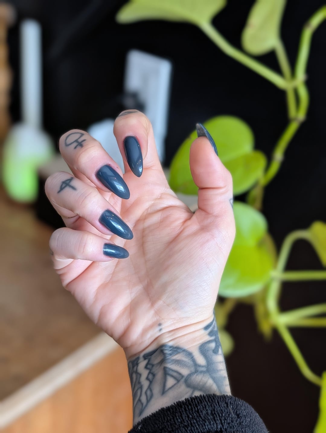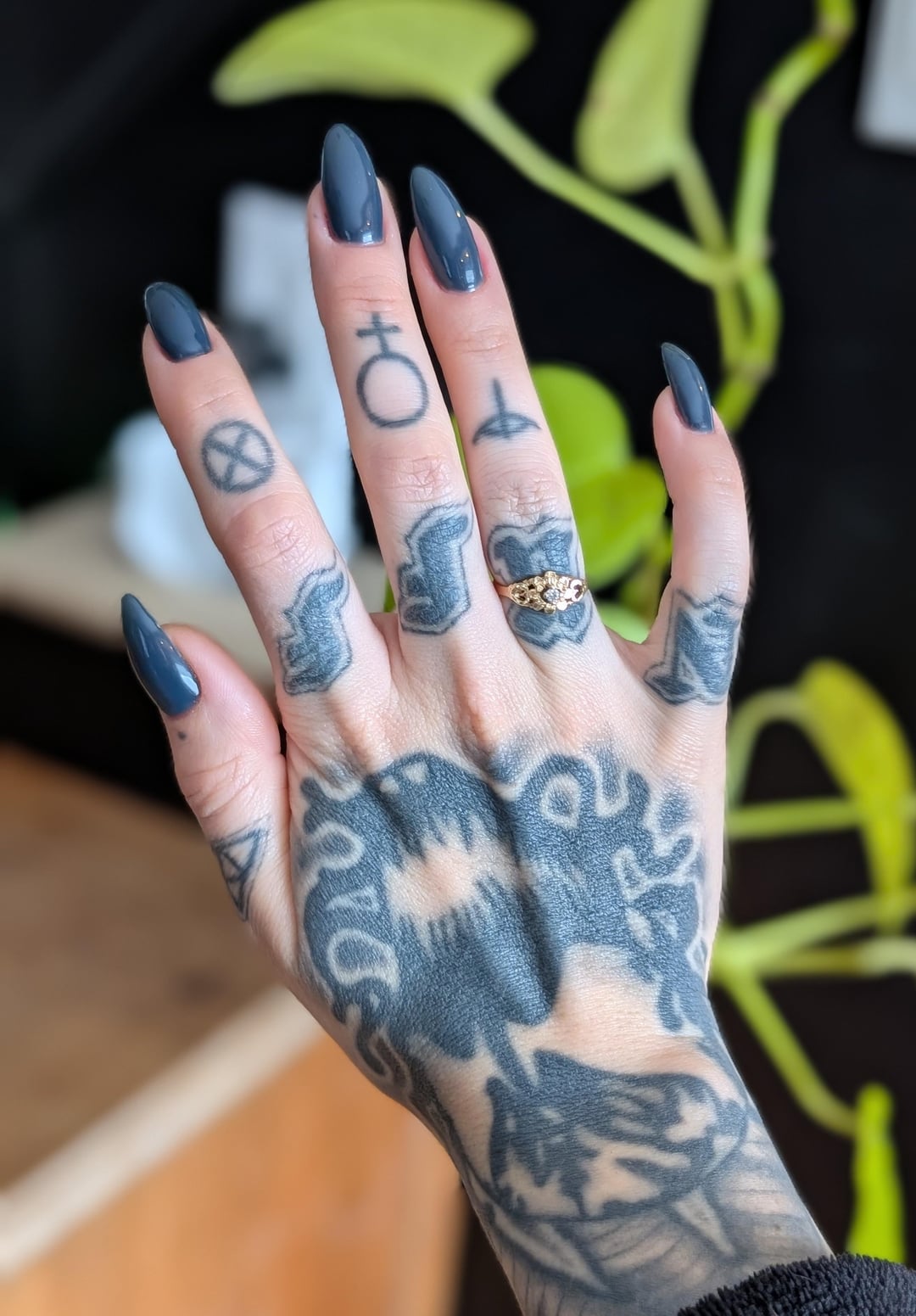 So I yried mixing colors to match the black of my tattoos. Pretty happy with the result. I used a black with blue undertone, lots of white and a dab of orange. The nails are my real lenght, no extension. With Builder gel. by JUDY11G
