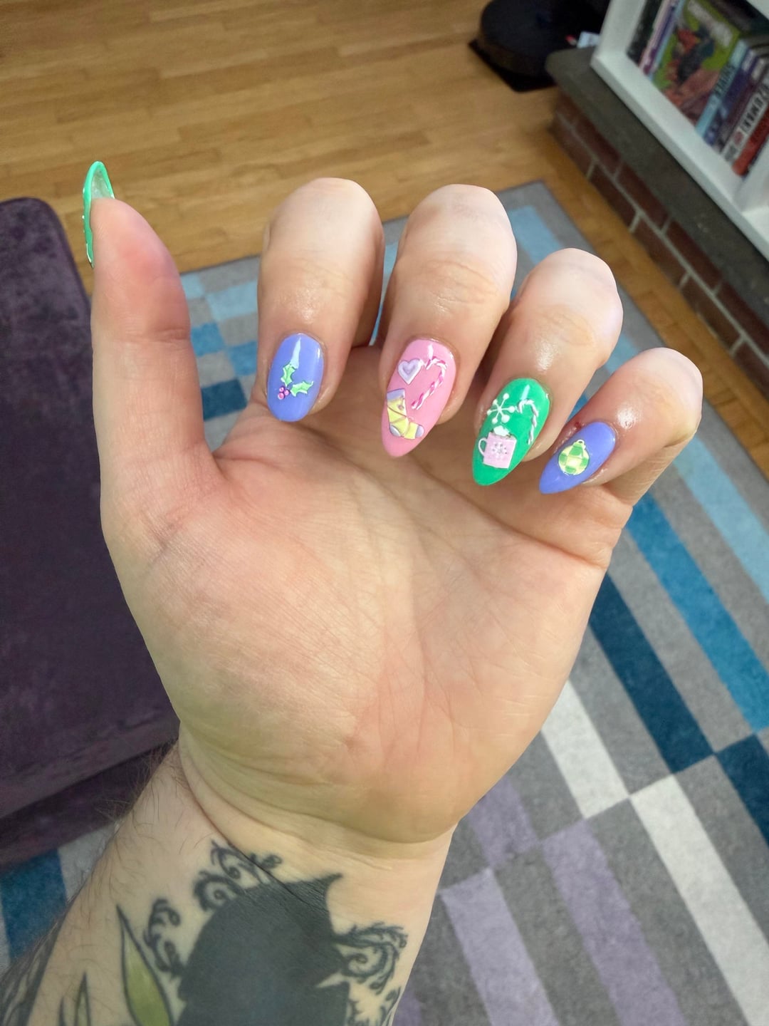 ILNP high dive & bottoms up; Essie muchi muchi; stickers from Deco Beauty; KBShimmer fillinโ groovy, smooth moves & clearly on top