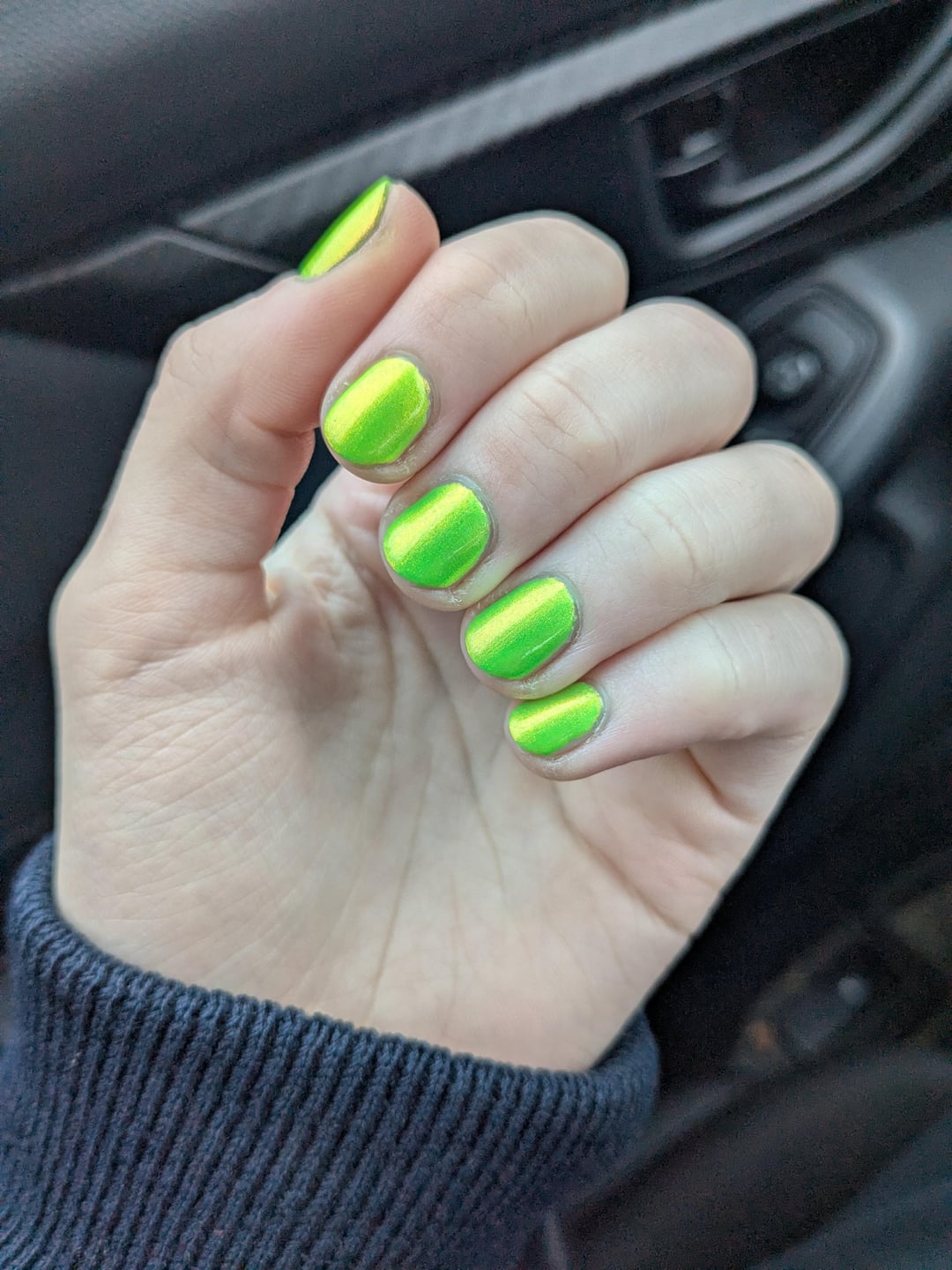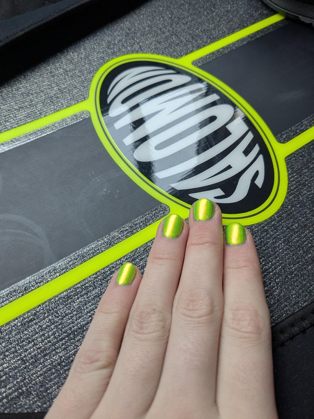 bugswithbongs on December 2, 2025 12:28 am products: 1x nailtiques formula 2 1x kbshimmer stay put hydrating base coat 3x polished for days uf glow 1x essie gel setter top coat after getting 9+ inches of snow in my area this weekend, i’m so stoked for the upcoming snowboarding season! i thought it would be fun to match with my snowboard :3 don’t mind the crusty cuticles, it’s rough out here lol