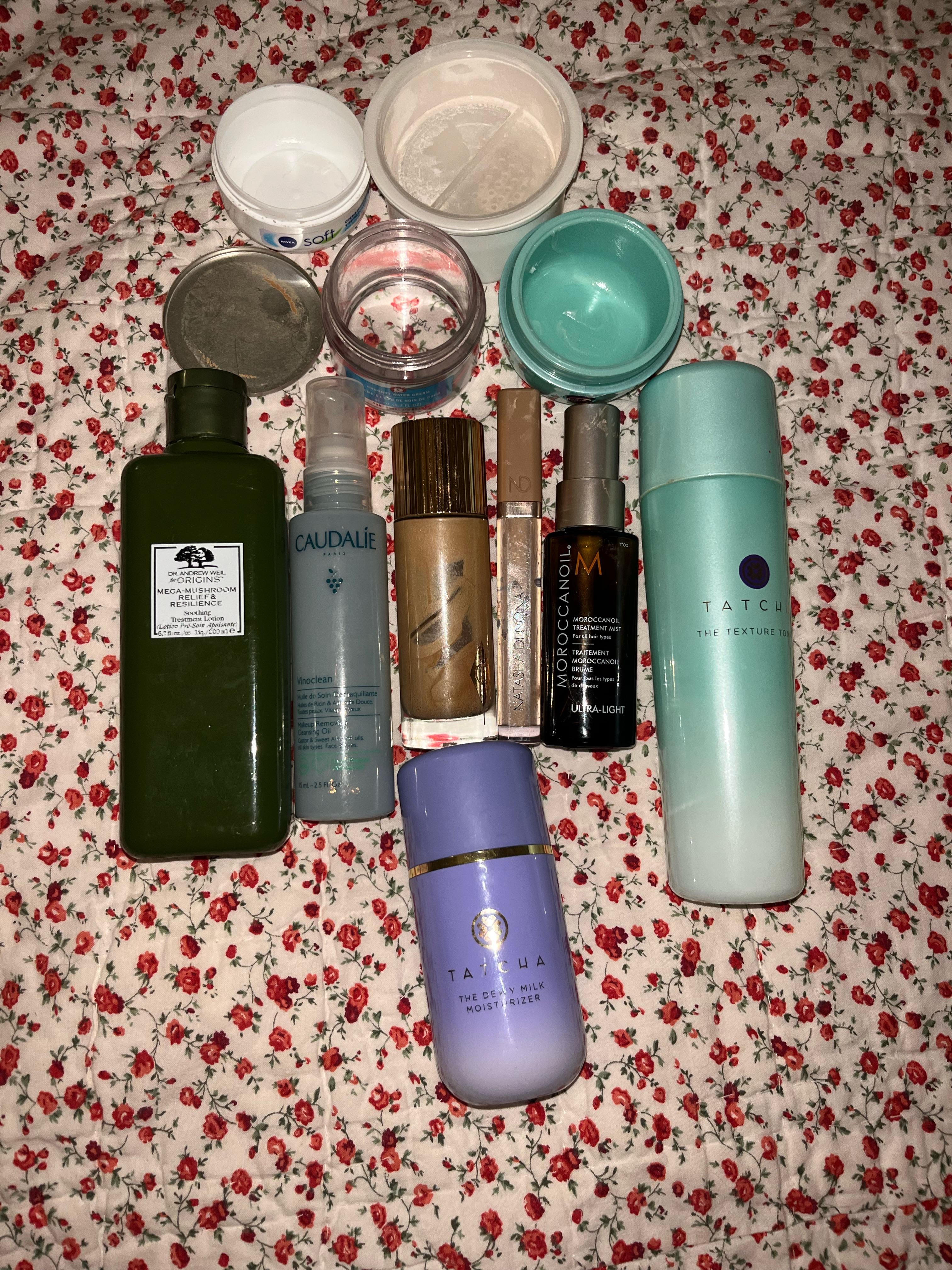 Top to bottom, left to right: Nivea Soft Crème, Crown Affair dry shampoo refill, CT airbrush flawless powder, First Aid Beauty Coconut water cream, Tatcha water cream, Origins Mega Mushroom, Caudalie oil cleanser, CT flawless filter, Natasha Denona concealer, Moroccan Oil treatment mist, Tatcha Texture Tonic, Tatcha dewy lightweight