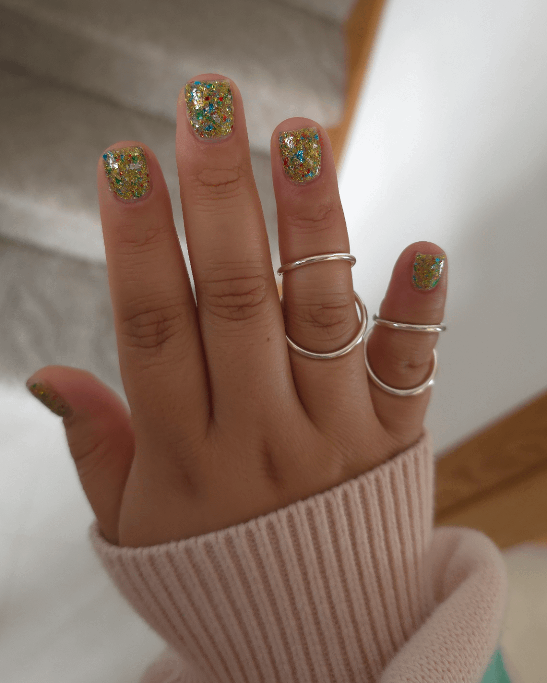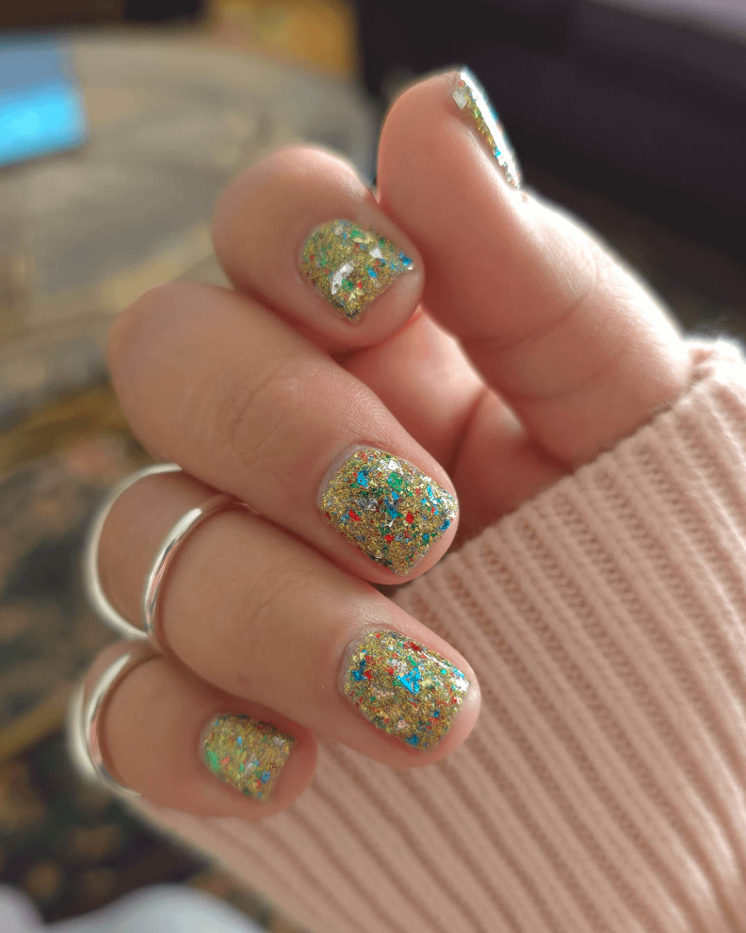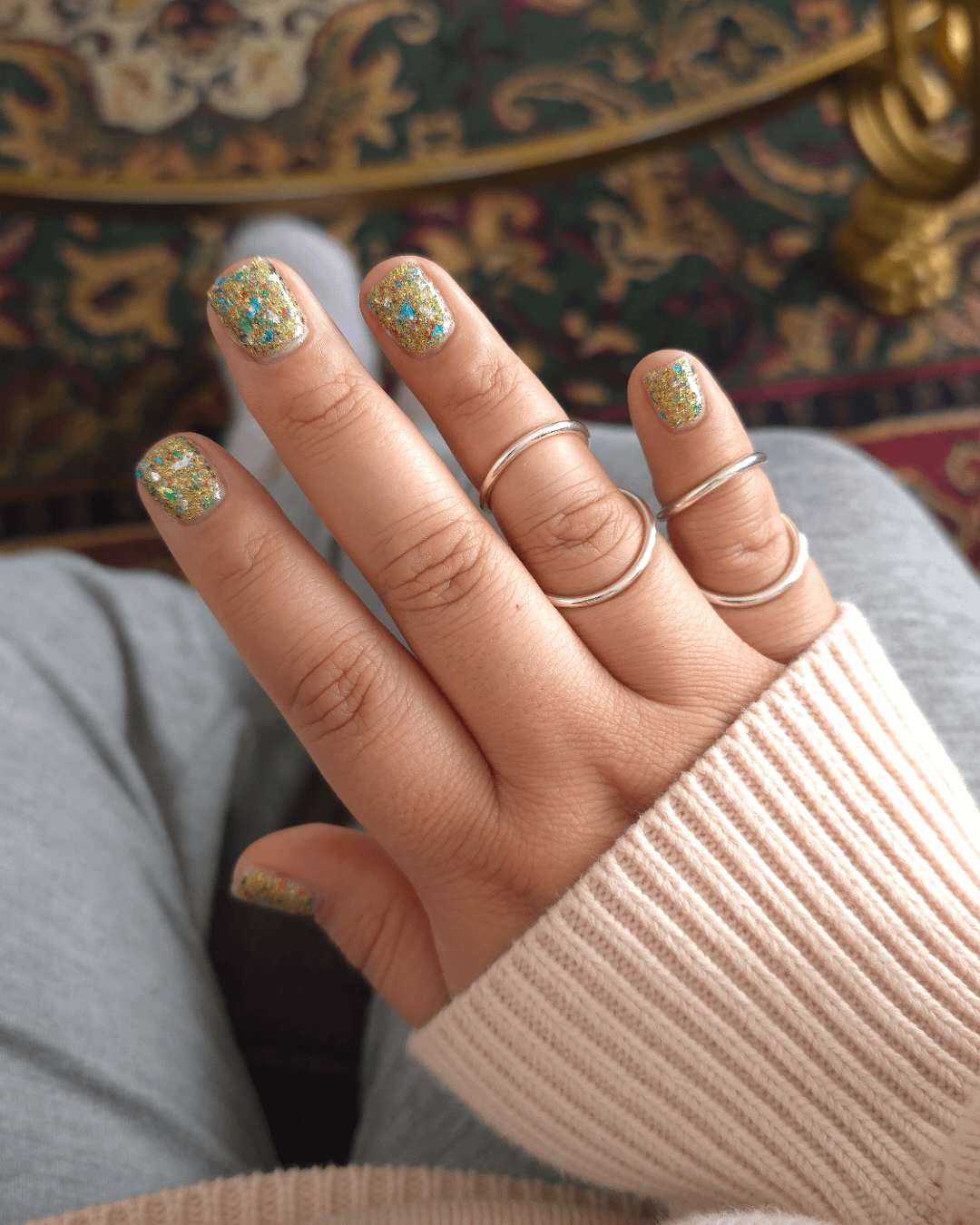 • i learned i should probably get a 'glitter grabber', this is a thirsty polish. i did 3 coats of top coat to get a smooth finish as i don't enjoy the texture finish. however, even then, some of my nails have a texture finish. i'm claiming defeat, i don't want to add a fourth coat of top coat 😭