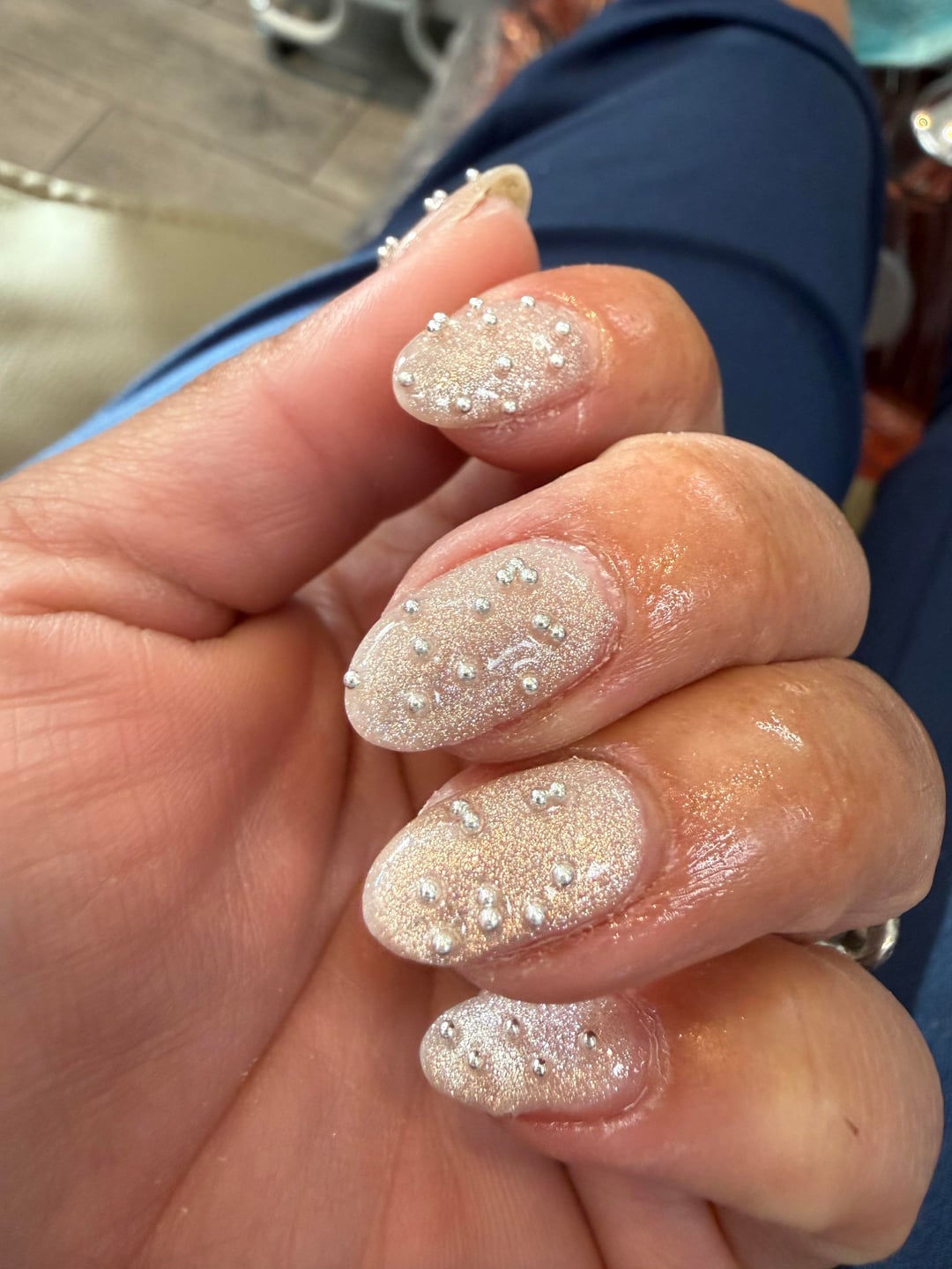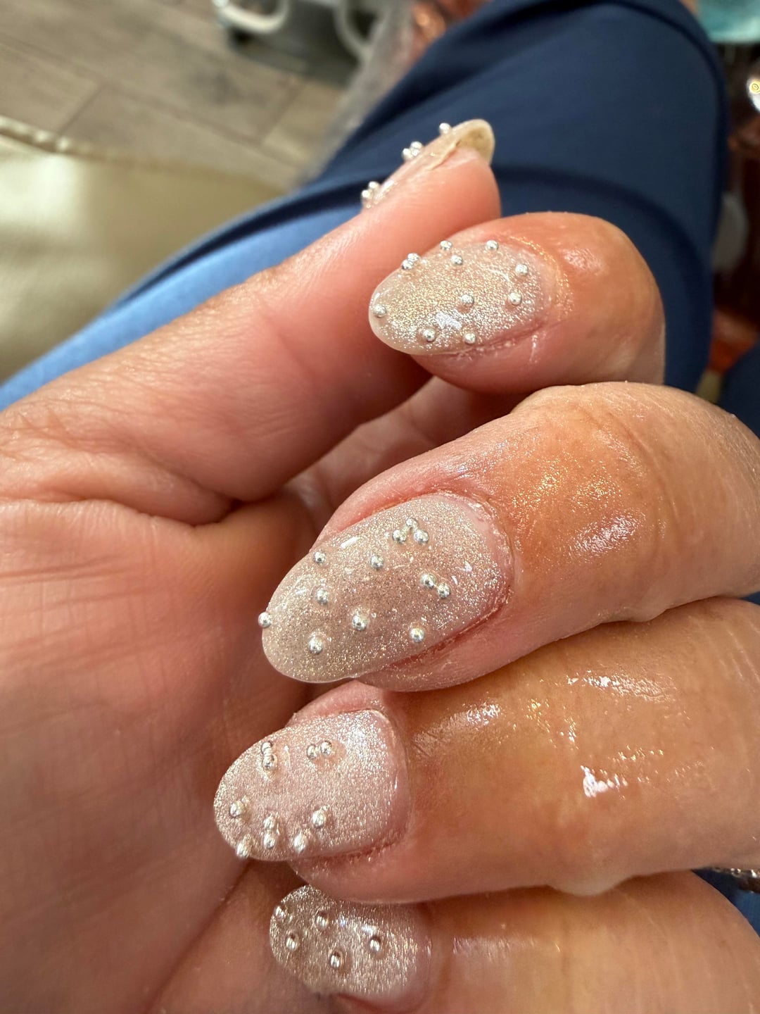 The cat eye is a bit busy for this specific design, and the beads are definitely haphazardly thrown on there as opposed to the inspo where they are in a uniform polka dot pattern.