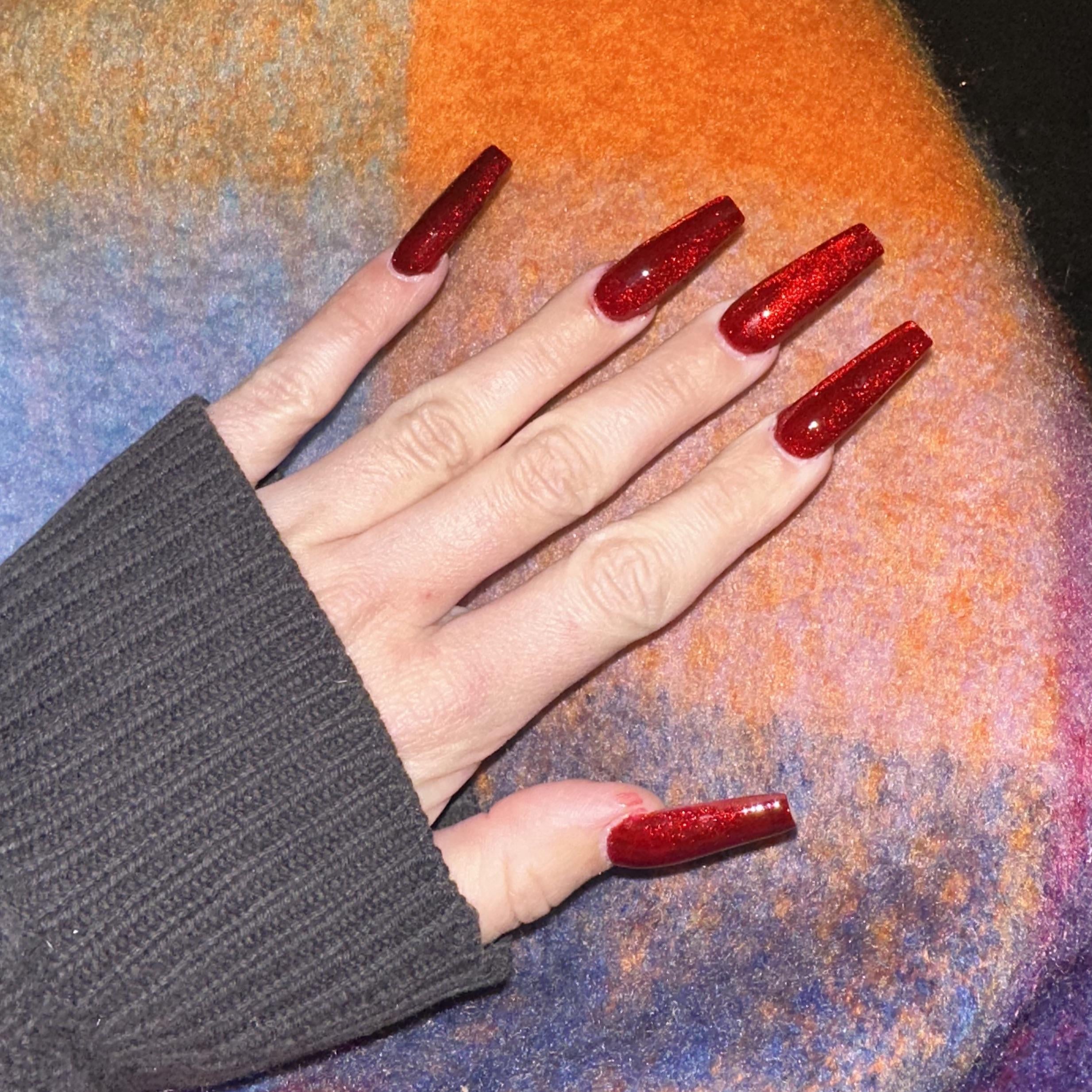 just finished these nails. went longer than usual and wanted more of a coffin shape but after using like 4 coats of polish to get the cat eye it really swallowed up the coffin and made them more of a rectangle. i feel like they really accentuate how boney my fingers are and how small my nail beds are. be honest do you think it looks good?? im disappointed after spending a few hours on these :/
