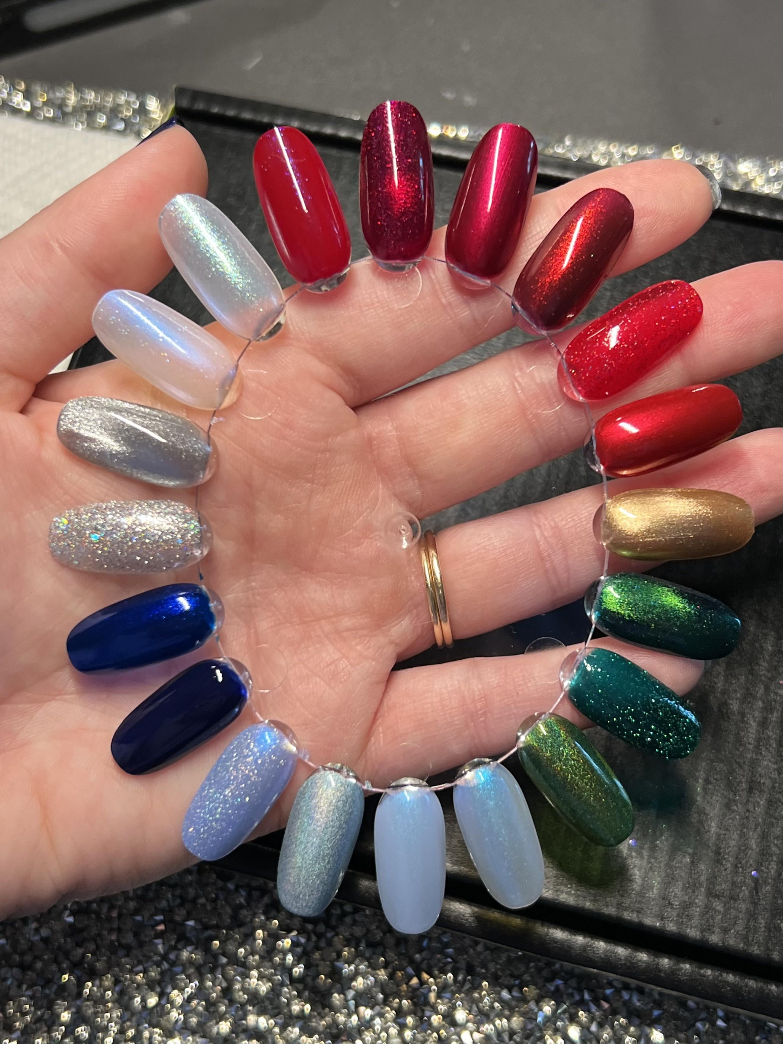 starting with red: OPI “nessa-ist rose” ⚰️, Starrily “mars”, Olive Ave “garnet”, Mooncat “the arsonist”, ILNP “joy”, Cracked “23 flavors”, OPI “sleigh bells bling”, Starrily “pluto”, Bee’s Knees “adaptable”, Zombie Claw “resting grinch face”, Ahmya “orion” ⚰️, Mooncat “sabertooth”, Salon Perfect “cinderella”, Polished for Days “enchanted to meet you”, OPI “havin’ a candy ol’ time”, OPI “chopstix snd stones”, Holo Taco “ride or diamond” ⚰️, Starrily “amulet”, Cirque “mystic moonstone”, Cracked “refraction” ⚰️