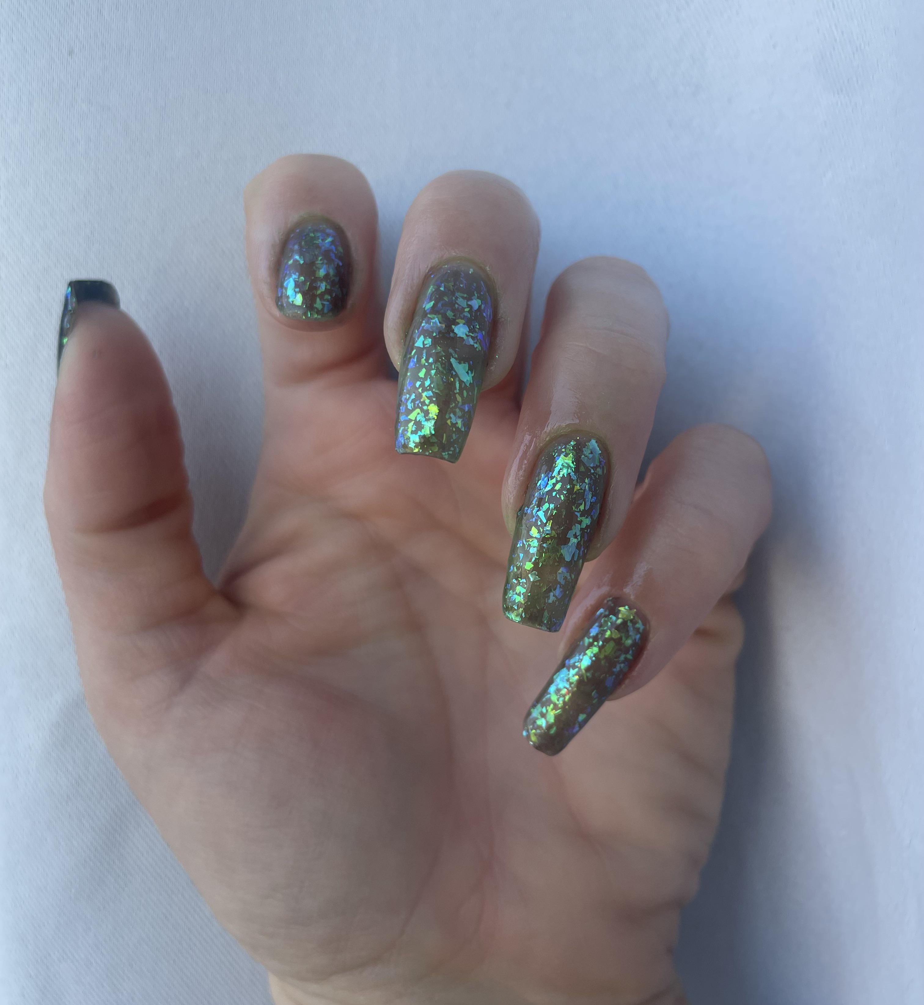 Love this color so much 🙌🏽 I got it after finding out about Labradorite from bDV and seeing it wasn’t sold anymore 😅 It’s pretty similar, but does anyone have a suggestion on how to get the base a TINY bit darker? Black underneath was way too dark lol. Also still so mad at my pointer for snapping when I moved my bin of polish 😒🥲