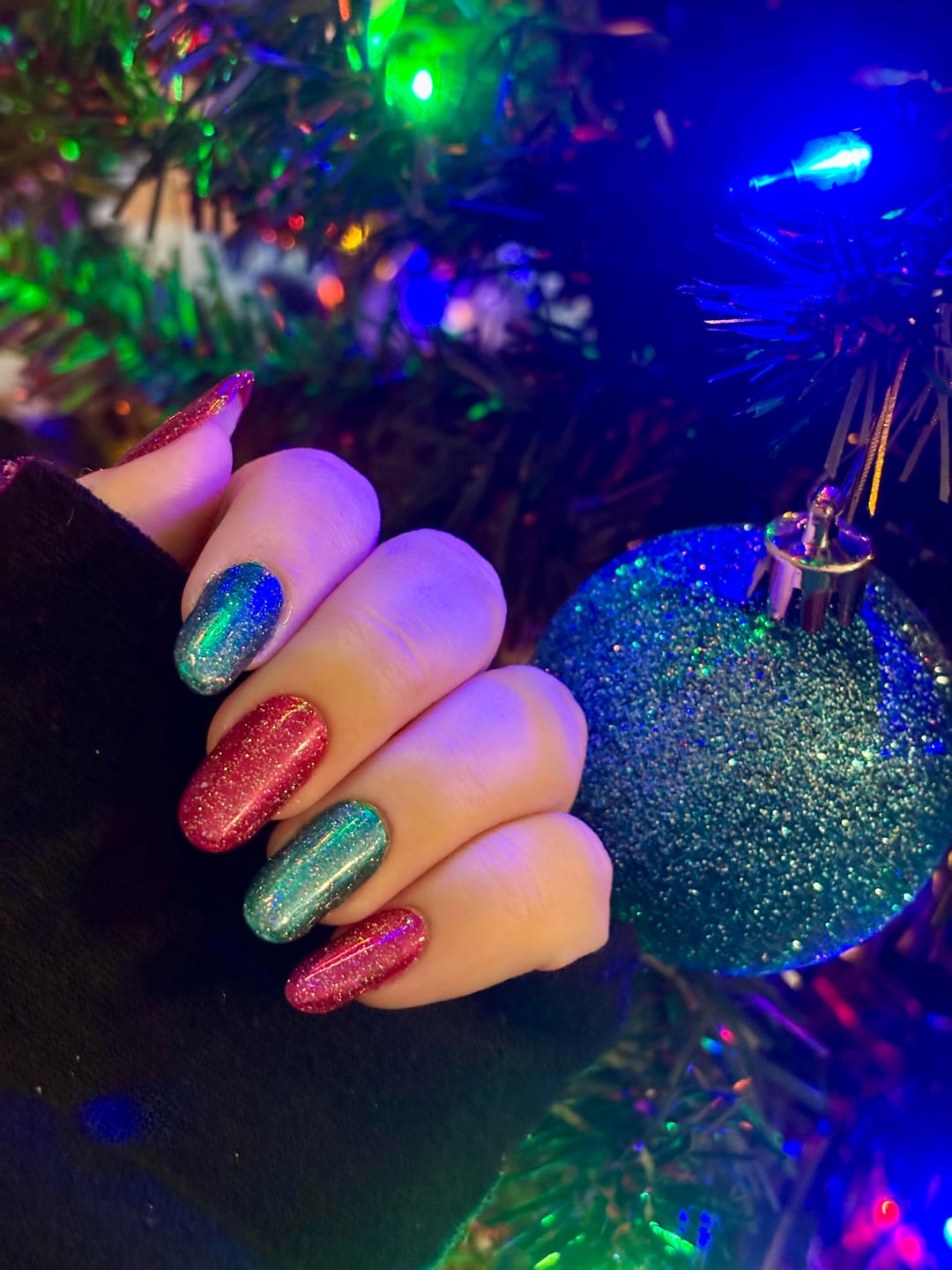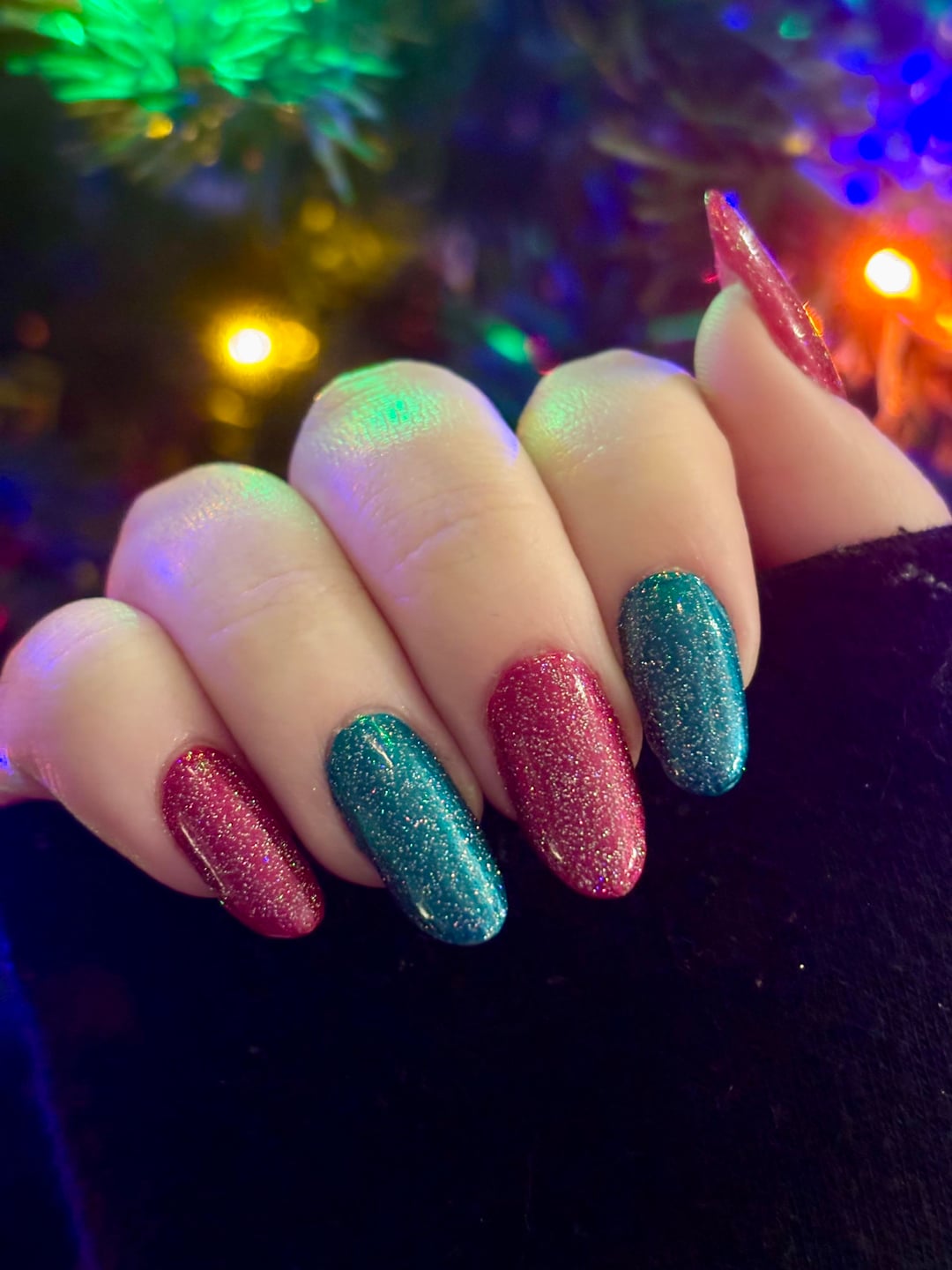 polishes: Nailtopia – Nailday Erday (pink), Candy Moyo – 988 (teal), China Glaze – Fairy Dust