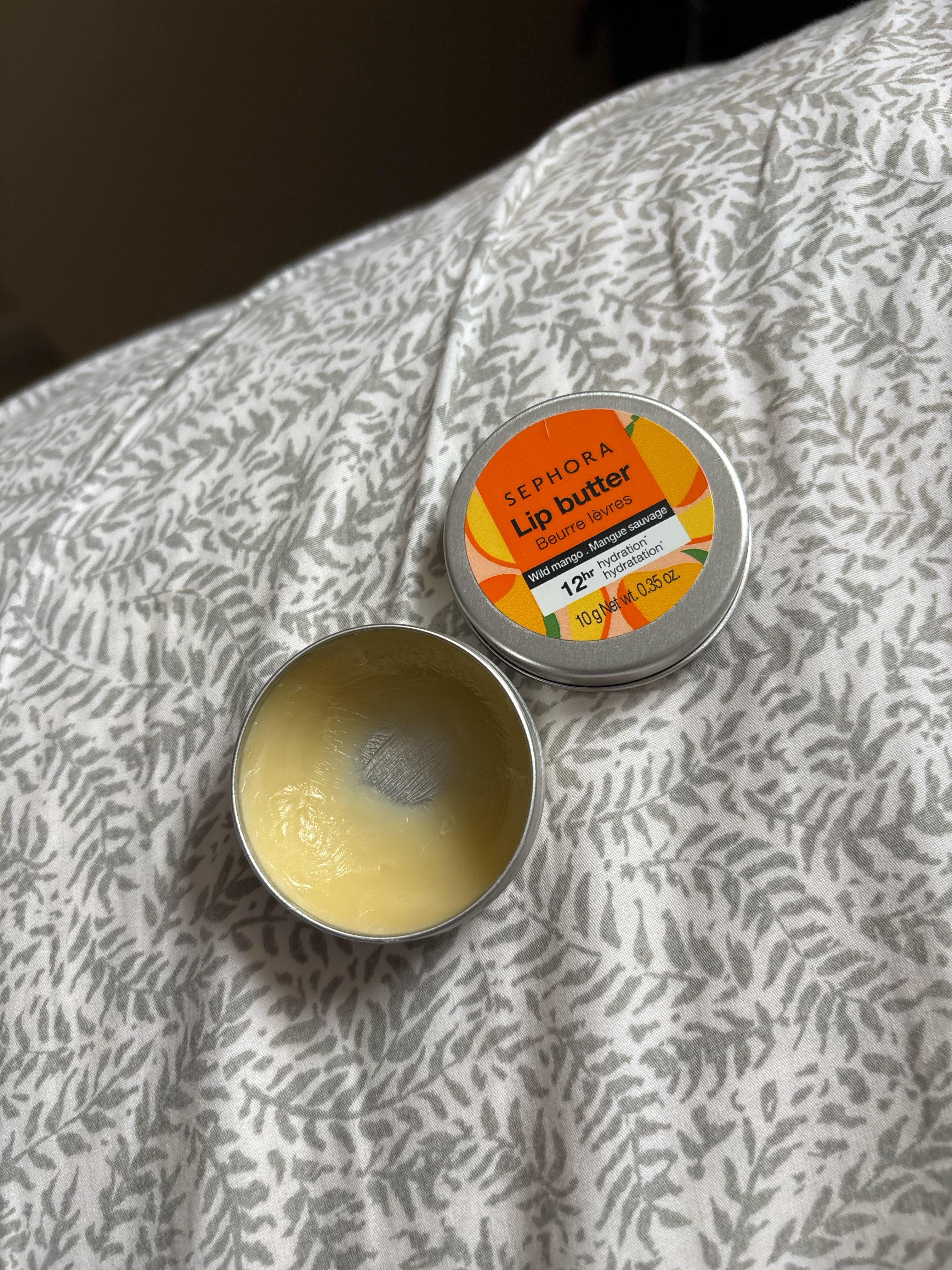 Sephora Lip butter in wild mango! About 6 months in? I use another one too but can’t find it right now. I usually use this at night but I used it this morning and discovered a baby pan! The scent has worn off making me use it less but still great formula for cheap!