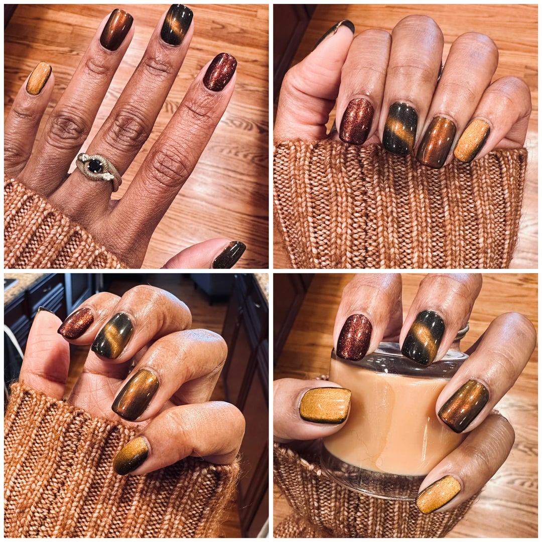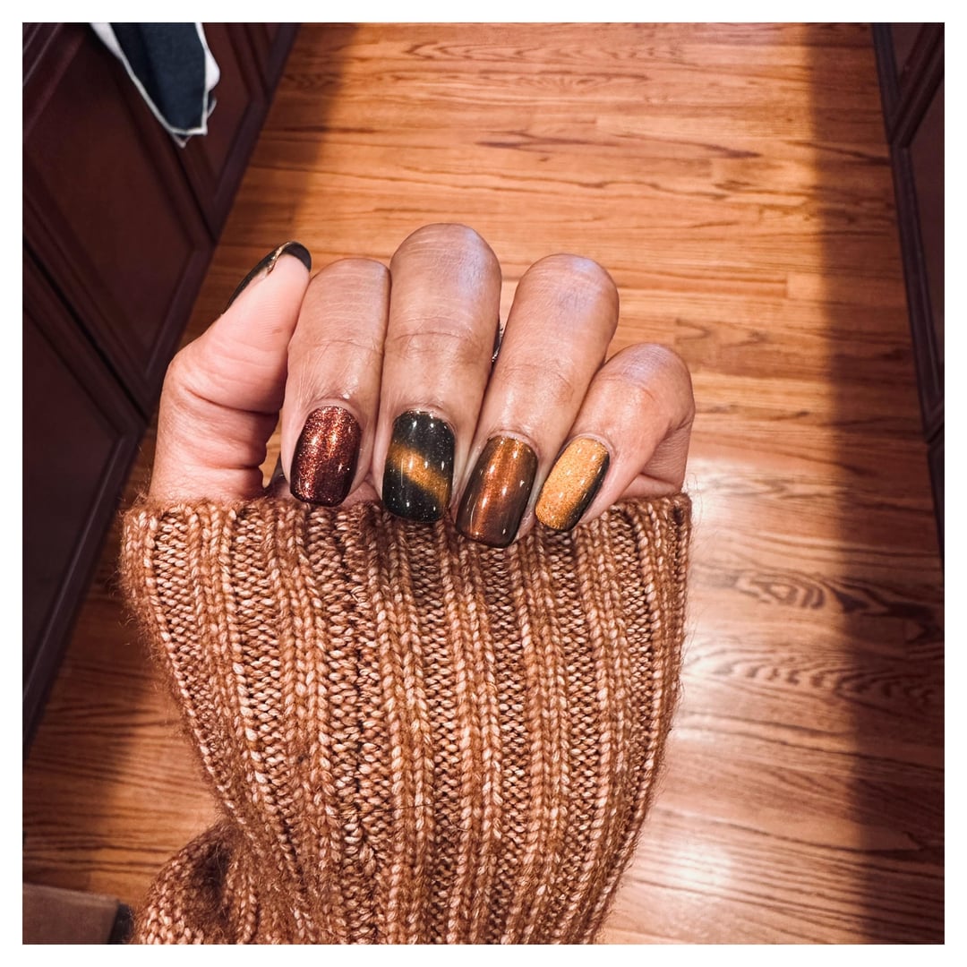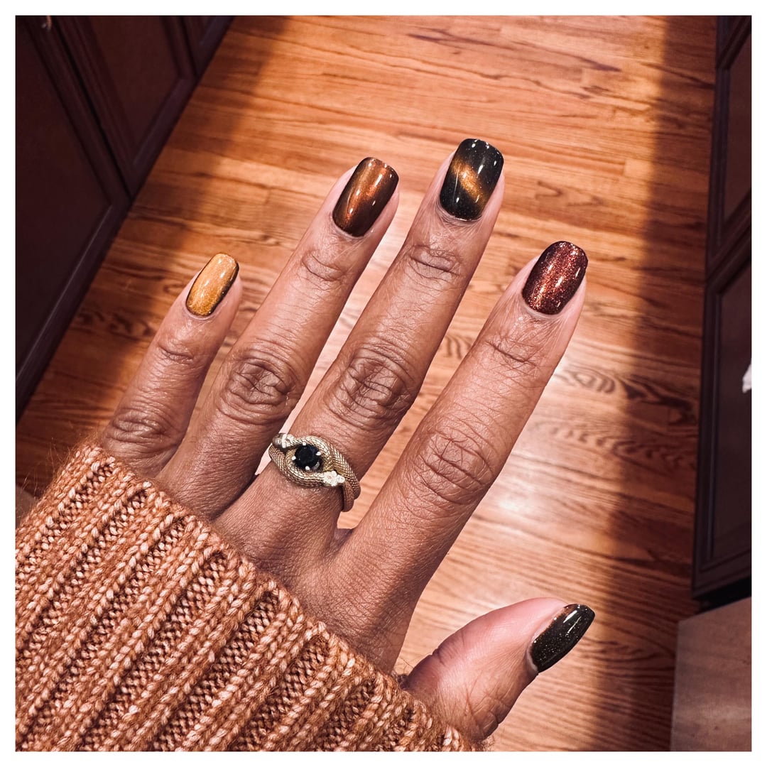 I did this manicure yesterday afternoon then wasn’t sure if I liked it, slept on it, and this morning I’ve decided that I actually do. Now I feel like I’m getting 90s browns vibes from it and I feel like I should be in the SWV use your heart music video 😅.