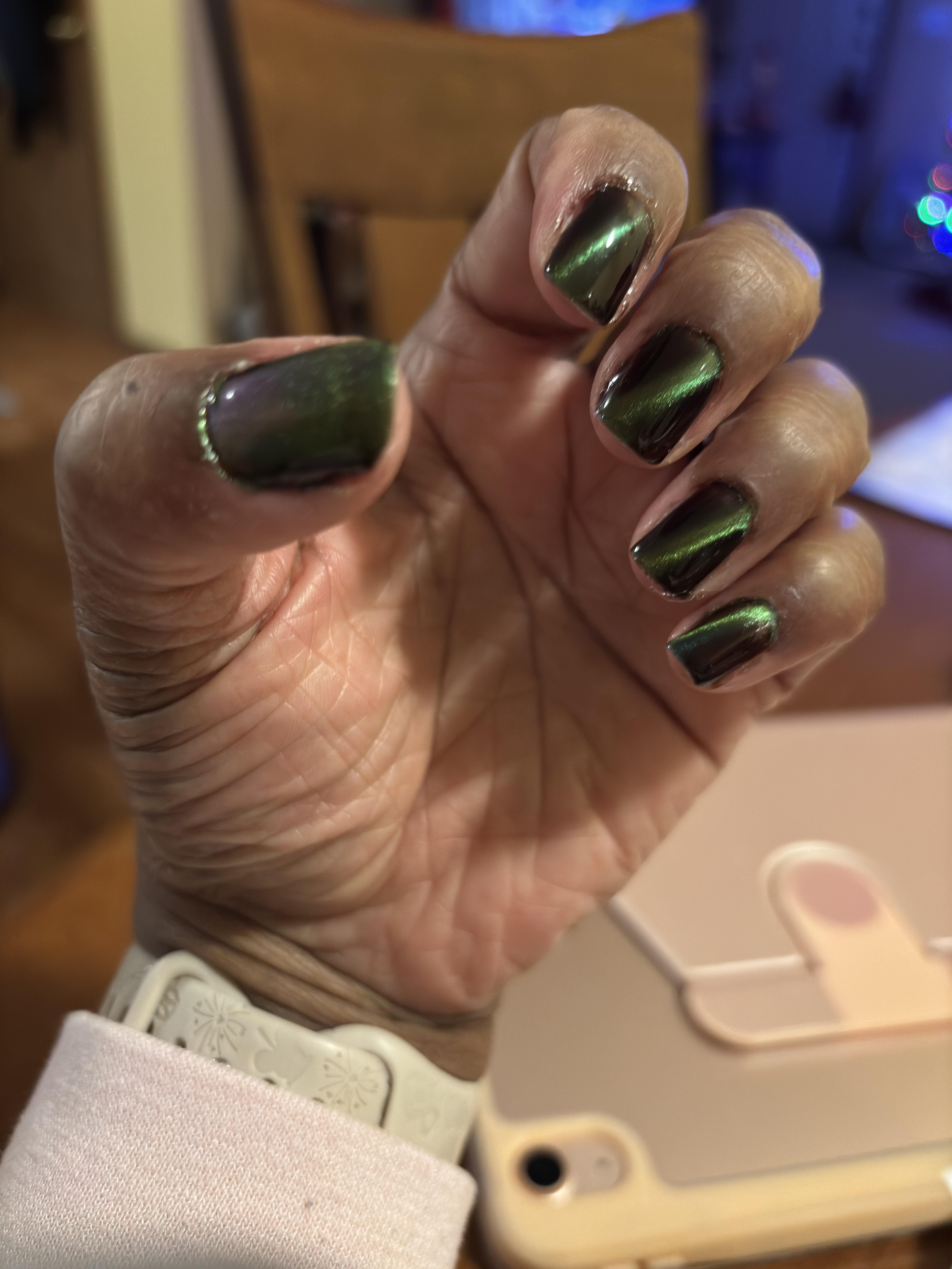 I had no idea just how reactive the metallic particles in this color would be. I’m in complete awe at how this week’s mani turned out. I’ve never gotten the catseye effect to be so intense. I decided to do a velvet effect on my thumb nails. Don’t mind me, I’ll just be over here staring at my nails all night.