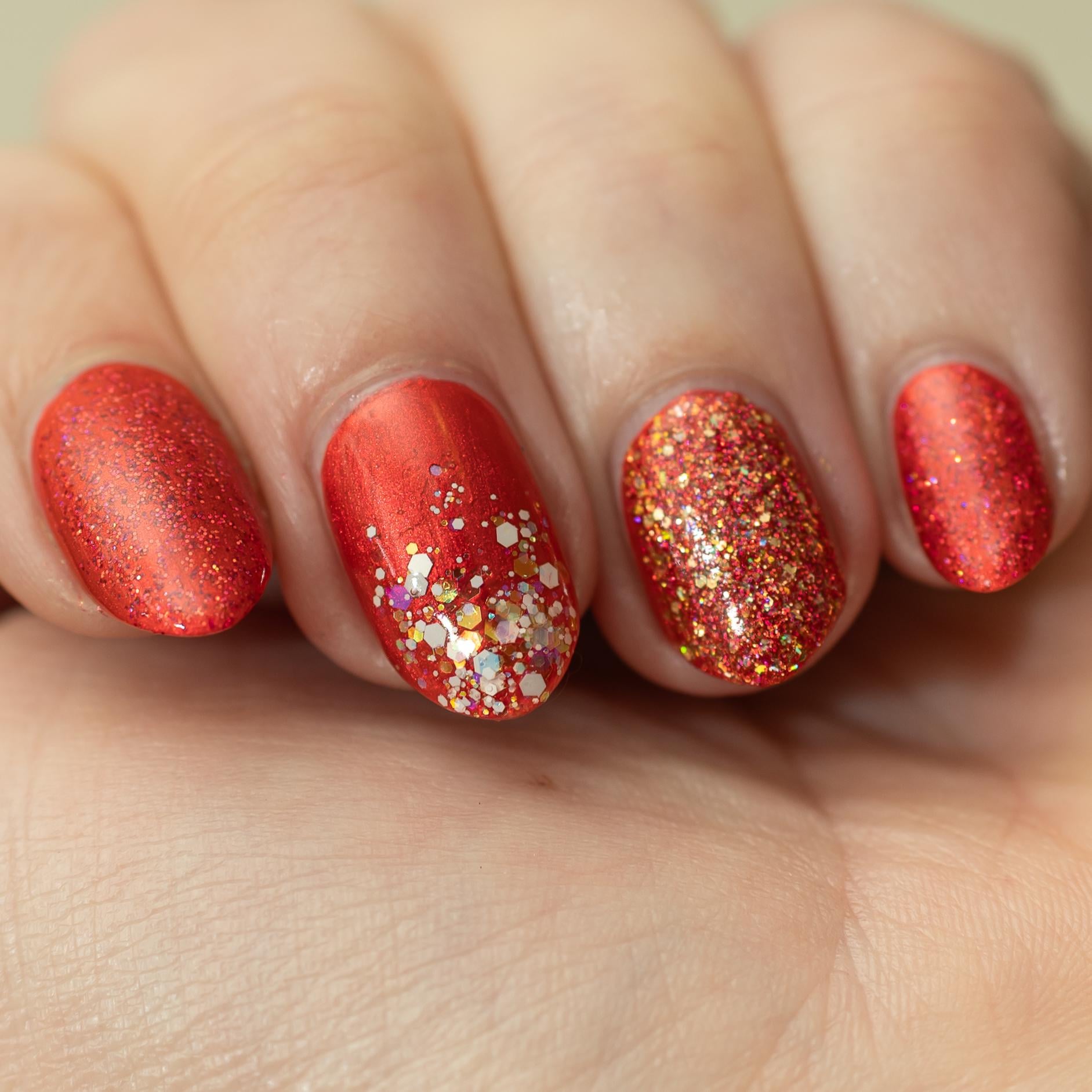 I wanted to do something festive today, and this is what I came up with. I started with a blurring base coat, then painted all of my nails with Zoya Ember. I then added a layer of Artie Mae Polish Slay-bells on my ring finger, Finding Feathers Lacquer Smells Like Victory on all but my middle finger, and finally, just a hint of Noodles Nail Polish Glisten Up on my middle finger. I finished off the look with a glossy topcoat on all nails.