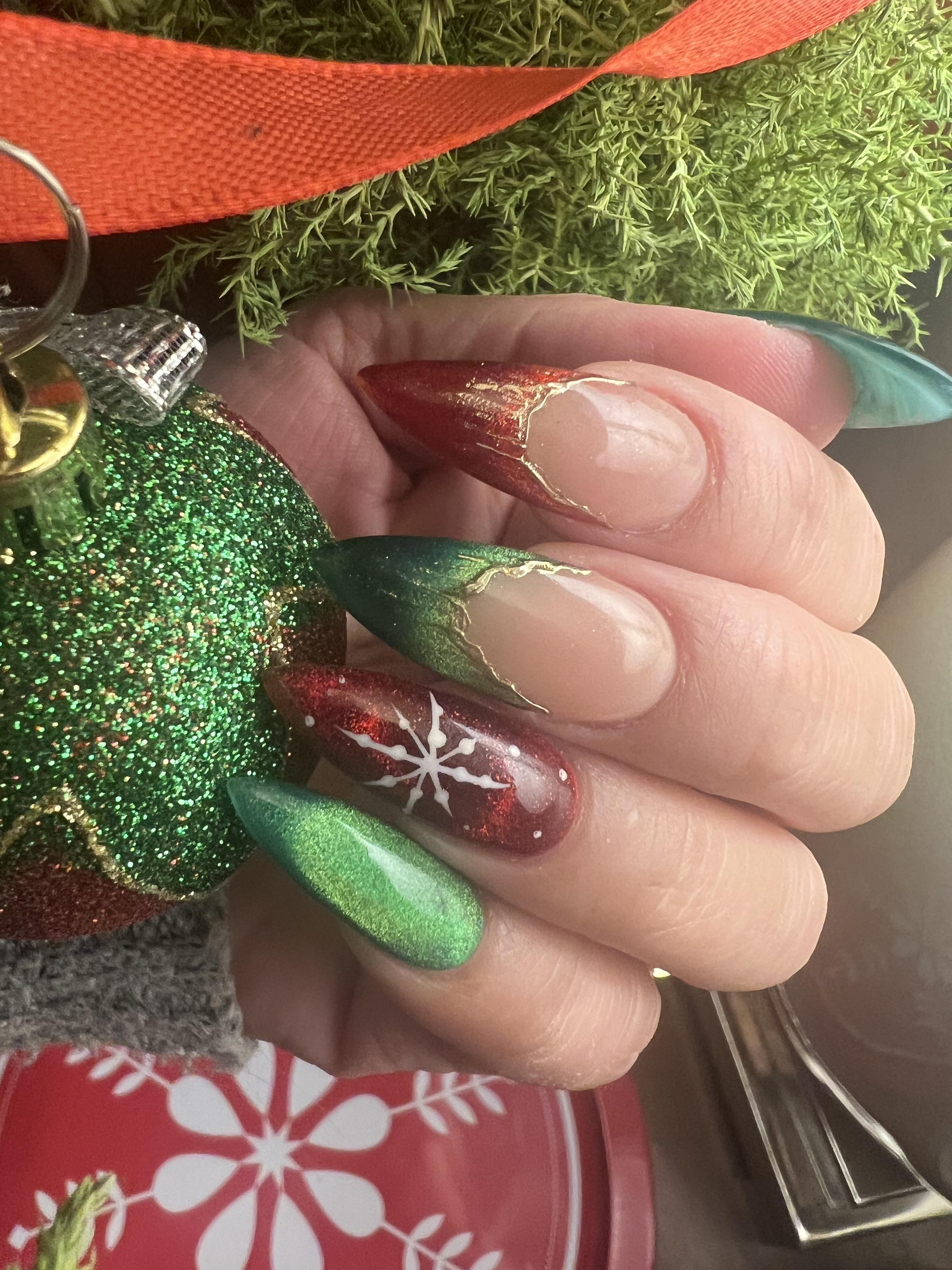 This is the second time I have gone to this nail tech and my first time having nail art done like this. I think she killed it!! ❤️💚❄️ by theSpicyOlive86