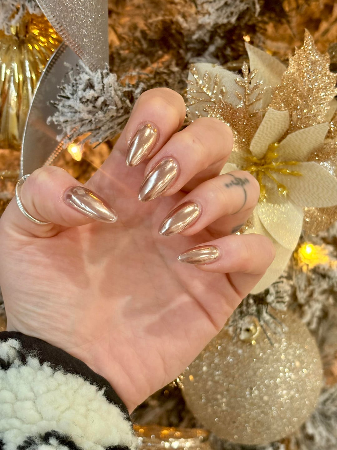 I wanted a very specific muted, almost-pinky gold chrome for christmas, but my salon only had very yellow-toned golds. So I asked my nail tech “have you ever mixed chromes?” and she was like :O